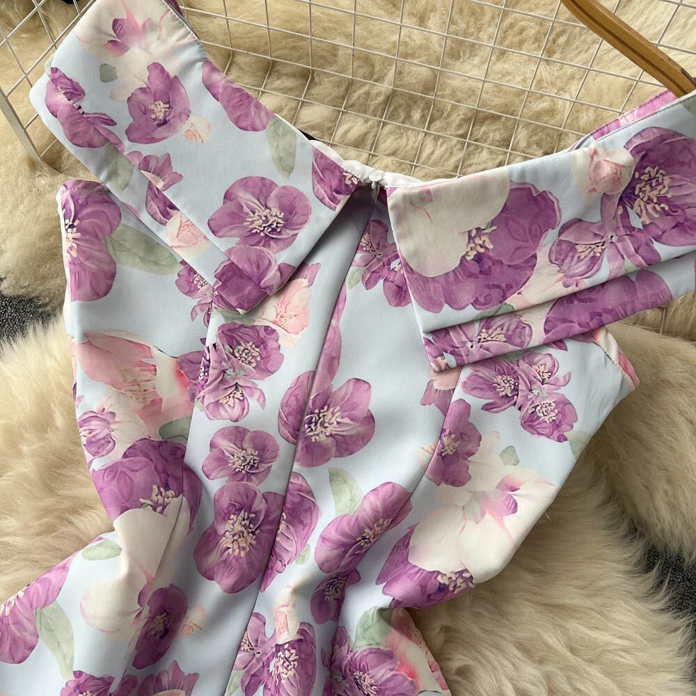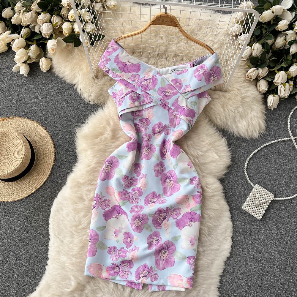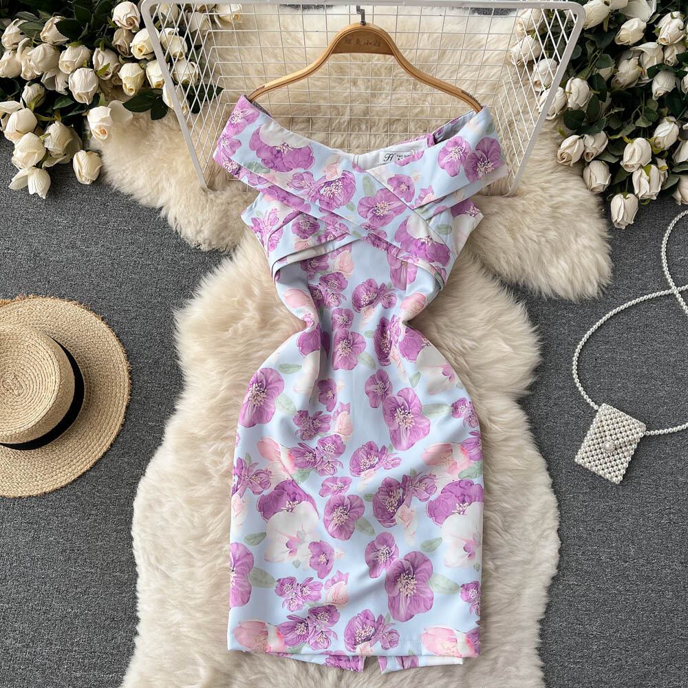 2022年夏新作韓国版レディースセクシーワンワードカラースリムバッグヒップローカット気質プリントスリットワンピース サマー 夏物 lyxaj70251544005