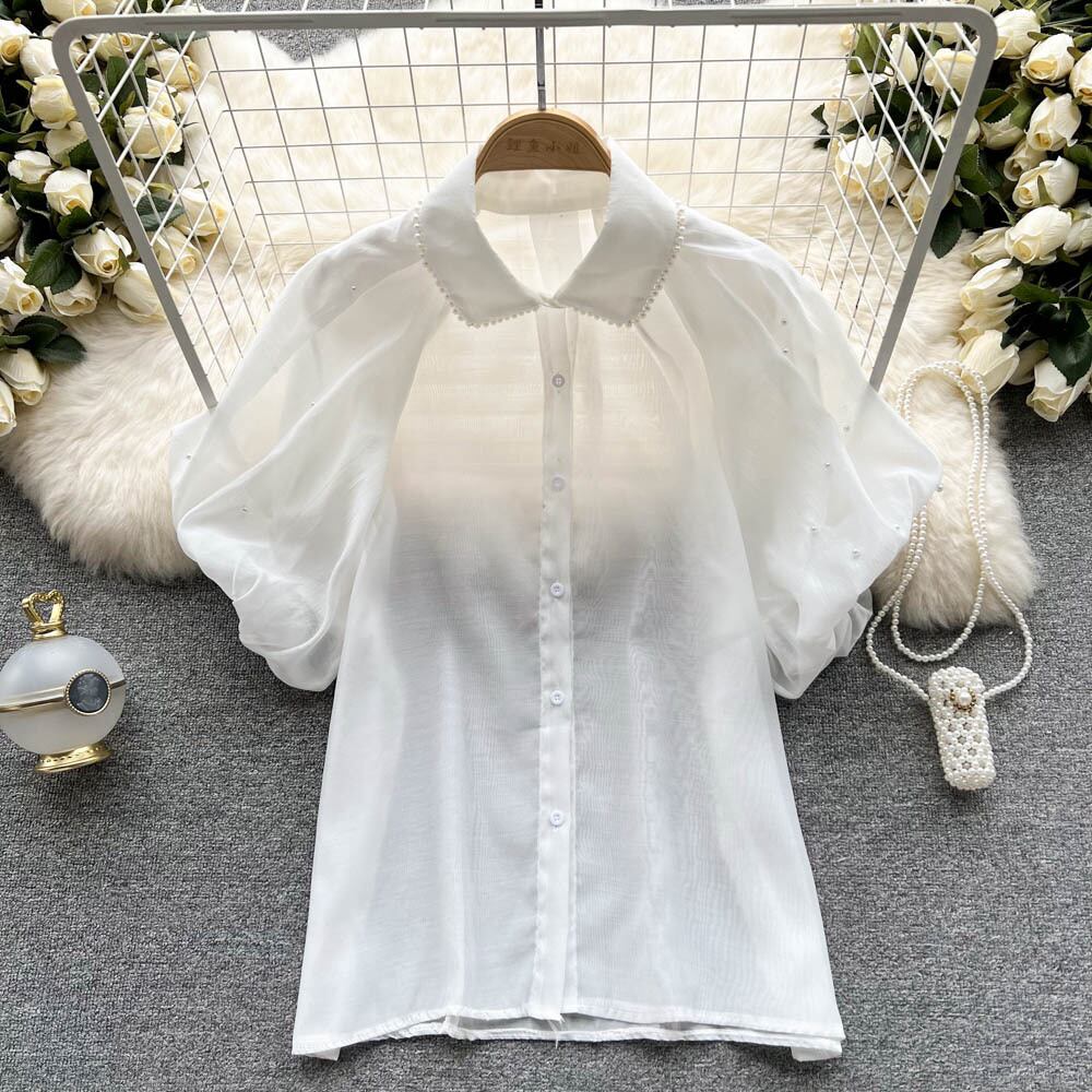 バブル半袖フレンチシフォンシャツレディース韓国ins2022夏新作ルーズビーズラペルトップトレンディ サマー 夏物 lyxaj26000811863