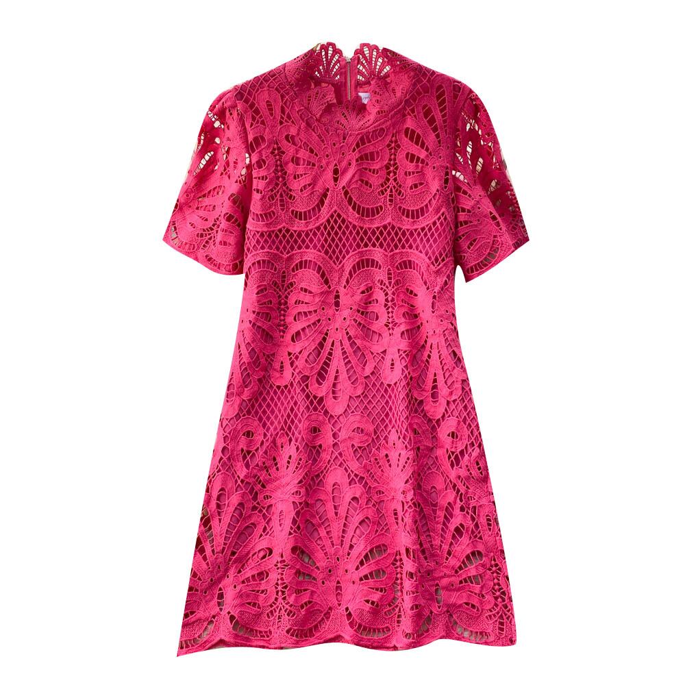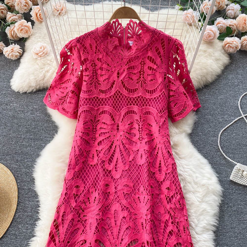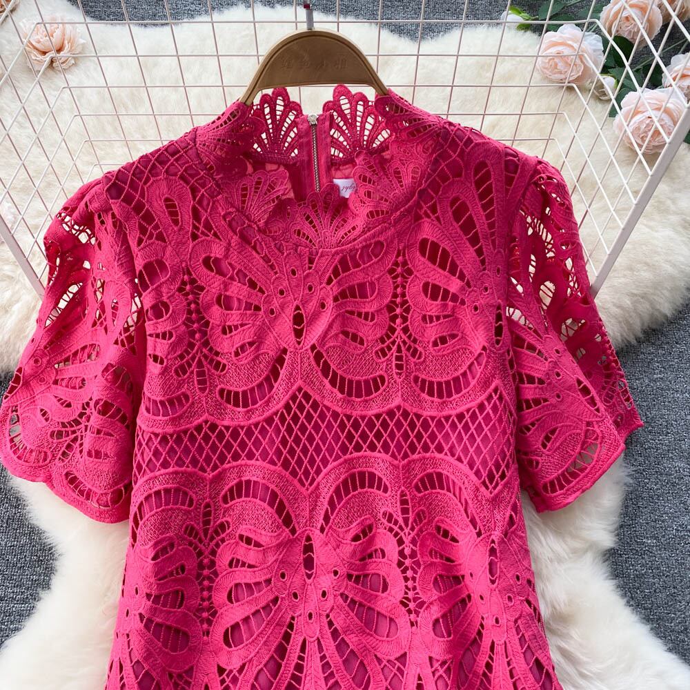 2022年春新作センスニッチくり抜いた薄手のレースミドル丈ラウンドネックルーズ半袖ワンピーストレンディ スプリング 春物 Oネック lyxaj3081370081