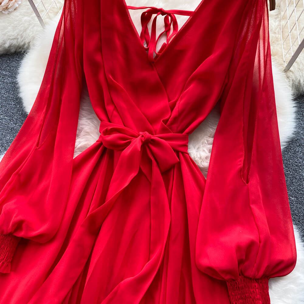 レトロな赤い気質セクシーなVネックバックレススリムバリシーサイドホリデービーチスカートルーズビッグスイングロングスカート レッド lyxaj97468118419