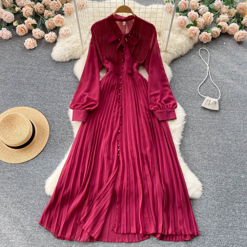 春の新作ウエストと細い蝶ネクタイプリーツドレスレディース気質蓮の葉ビッグスイングロングスカート リボン スプリング 春物 lyxaj90121663452