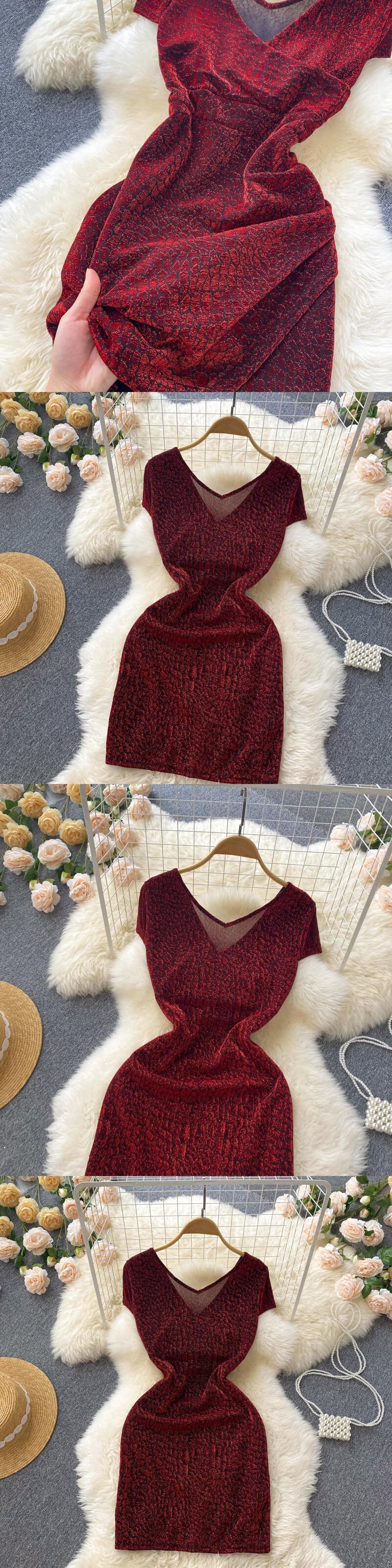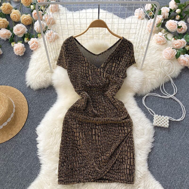 夏のセクシーな女性らしさ気質Vネック不規則なタイトフィット薄い光沢のあるシルクショートパッケージヒップドレス半袖 ハーフスリーブ サマー 夏物 lyxaj38675501389
