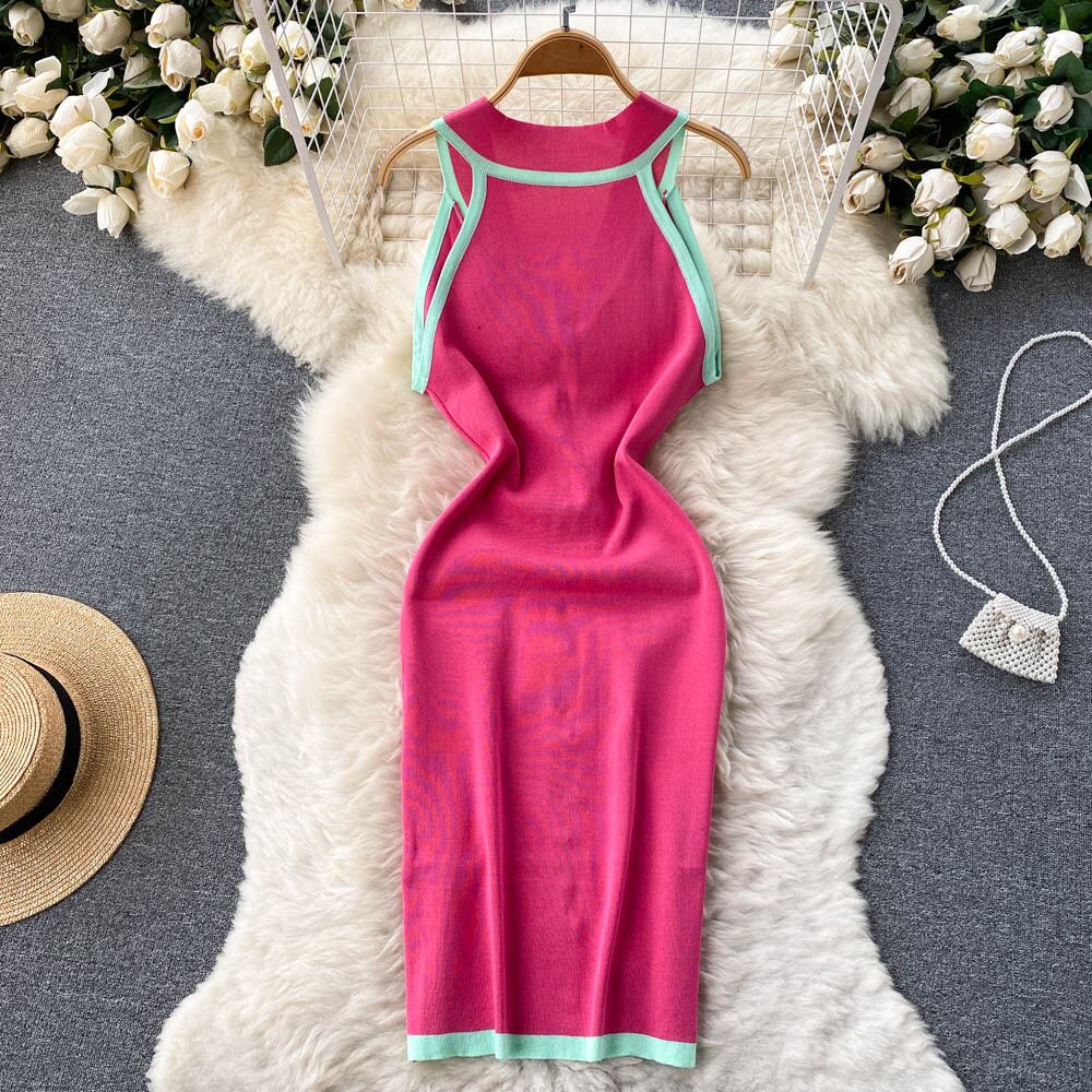ノースリーブのセクシーなカラーブロックニット2022年春夏新韓国バージョンVネックシングルブレストスリムバッグヒップレディースドレス スプリング 春物 サマー 夏物 lyxaj27372322248