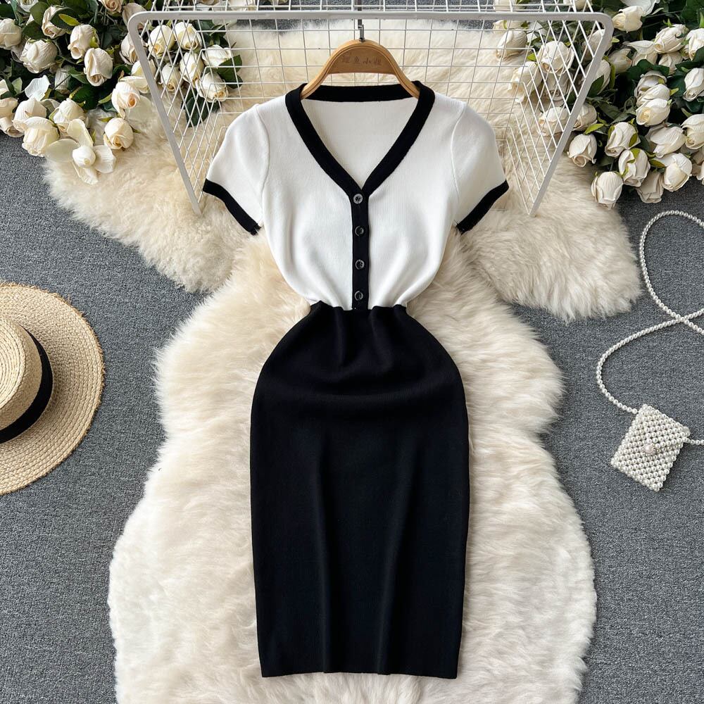 2022年夏の新作フレンチスタイルスモールフレグランススタイルVネックボタンステッチスリミングミドル丈ウエストバッグヒップドレス サマー 夏物 lyxaj78630203279