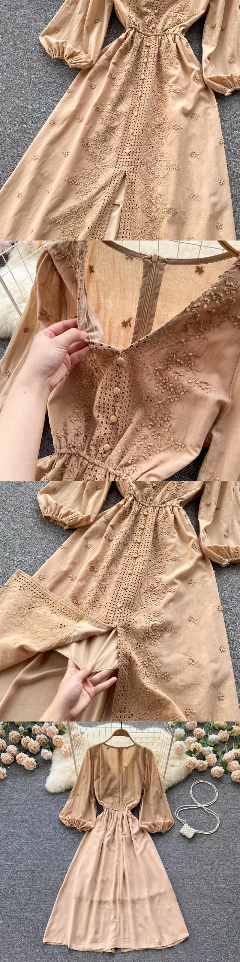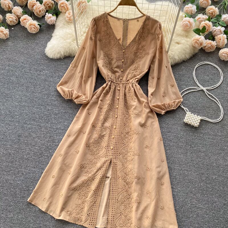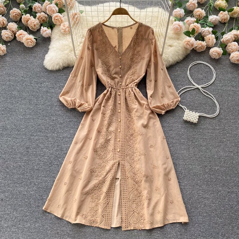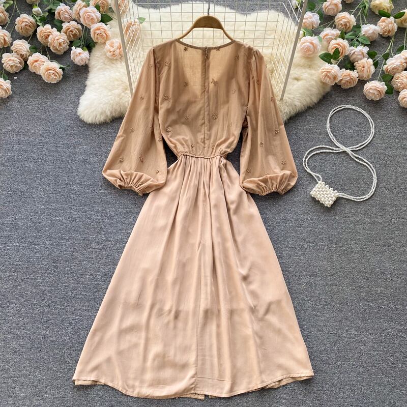 パレススタイルのシンプルでエレガントなVネック長袖シングルブレストレースアップウエストは細くて無地のインロング膝丈ワンピース ソリッドカラー lyxaj91132694619