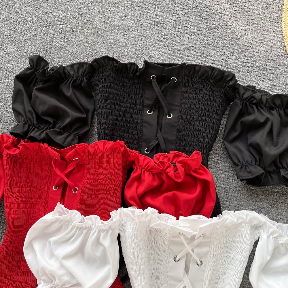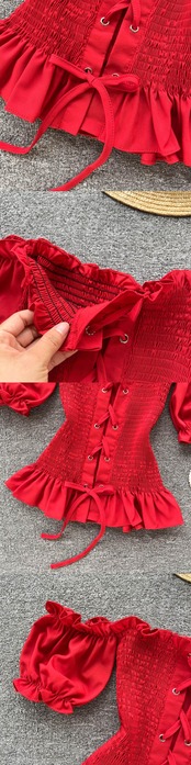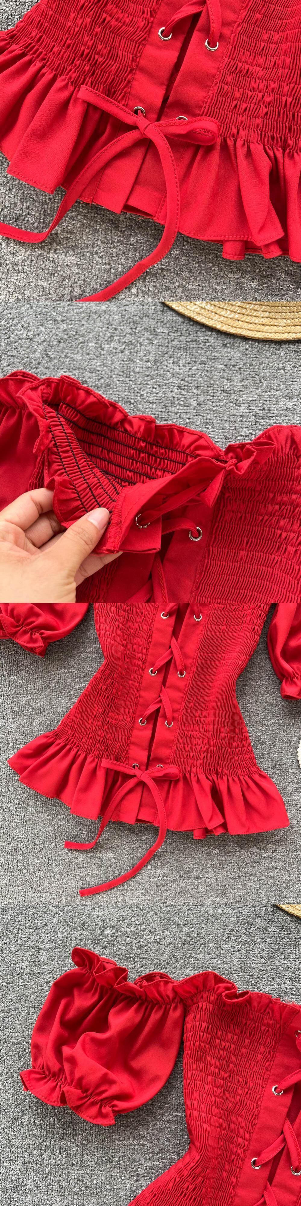 香港風味のセクシーなカビエッジバブル半袖ワンワードネックオフショルダーデザインフレンチレトロレースフリルトップ レッド lyxaj19975873516