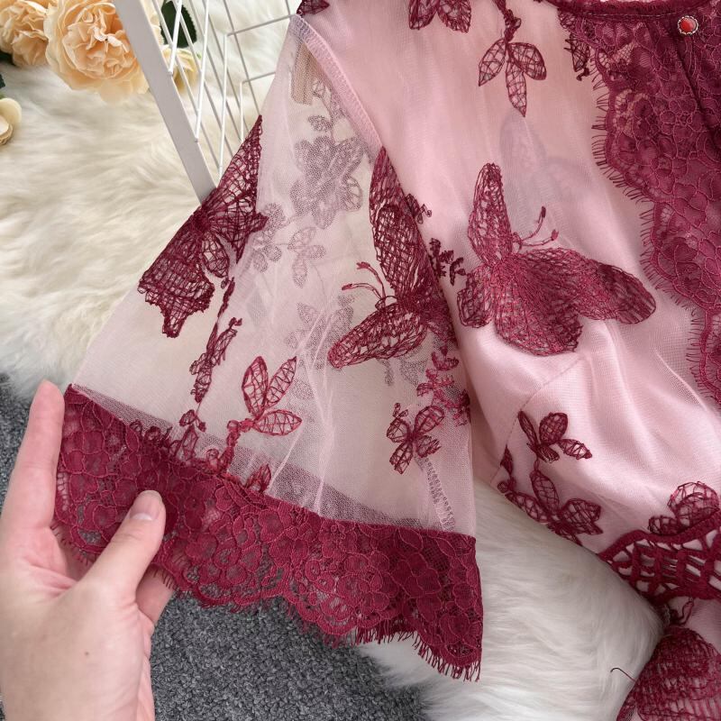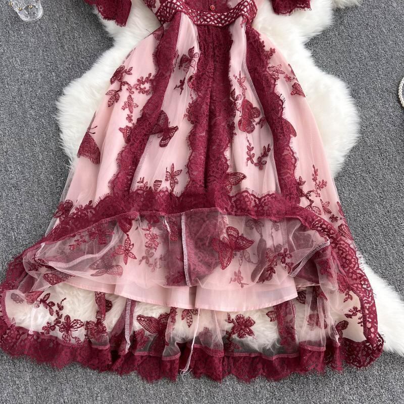 メッシュレースバタフライ刺繡ステッチラウンドネック春と夏フレンチレトロドレスウエストフリル妖精ドレス ロング 刺繍 スプリング 春物 サマー 夏物 スカート Oネック lyxaj37988823224