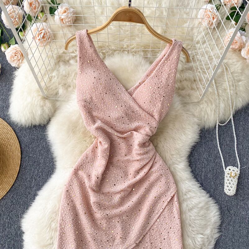 ウエスタンスタイルのセクシーなクロスVネックスリムな新しいきらびやかなスパンコールウエストプリーツハイウエストイレギュラースリットドレス ハイウェスト lyxaj5616428757