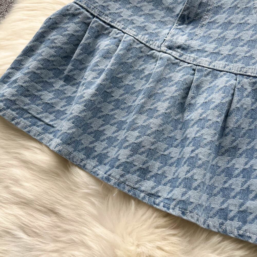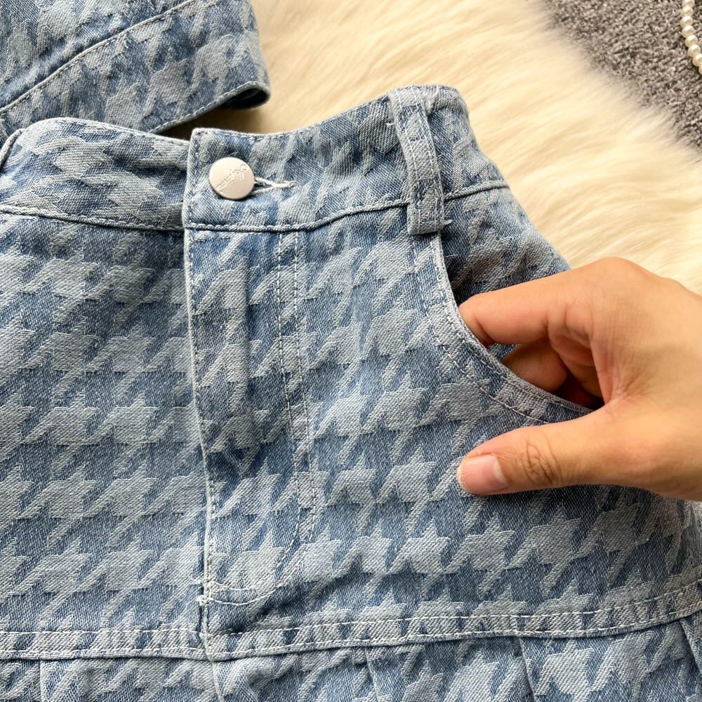 香港スタイルのレトロな千鳥格子ファッションデニムスーツ女性のショートクロップトップハイウエストデニムスカートツーピースタイド ハイウェスト lyxaj11449756374