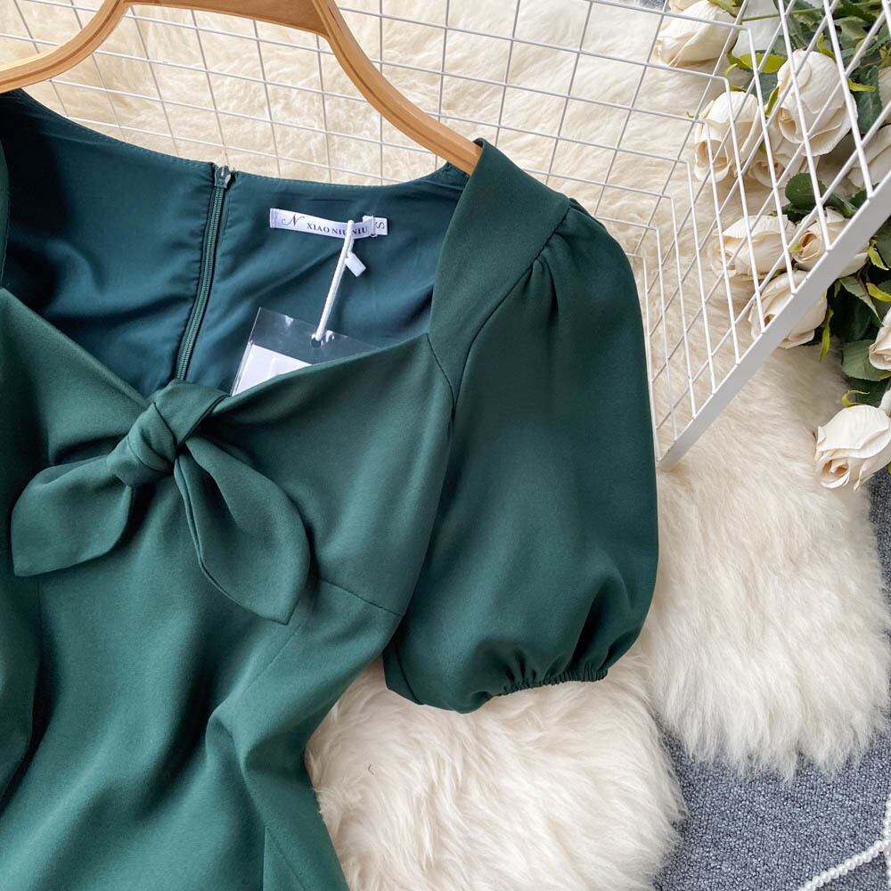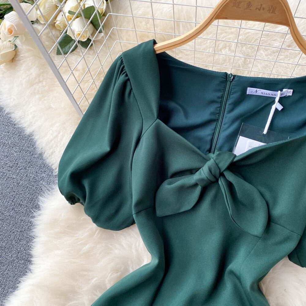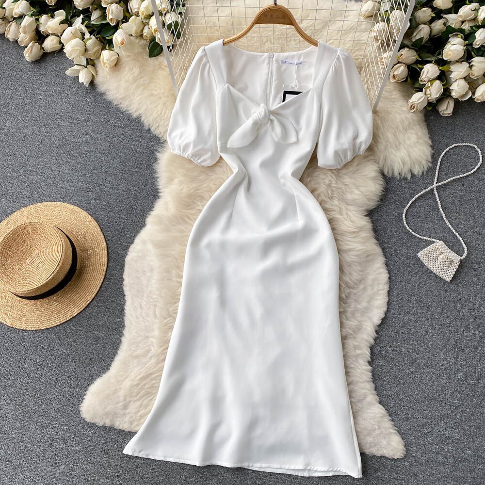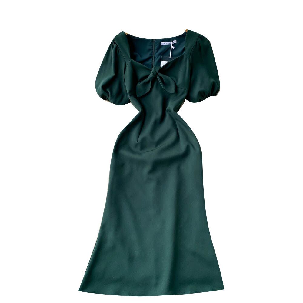 夏の新しいフレンチレトロスタイルのパフスリーブボウウエストスリム気質ミドル丈スクエアネックドレス リボン サマー 夏物 スクウェア lyxaj30663292261