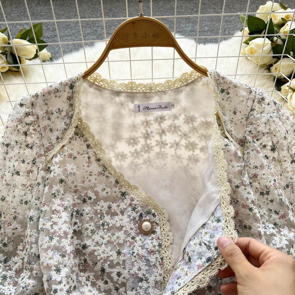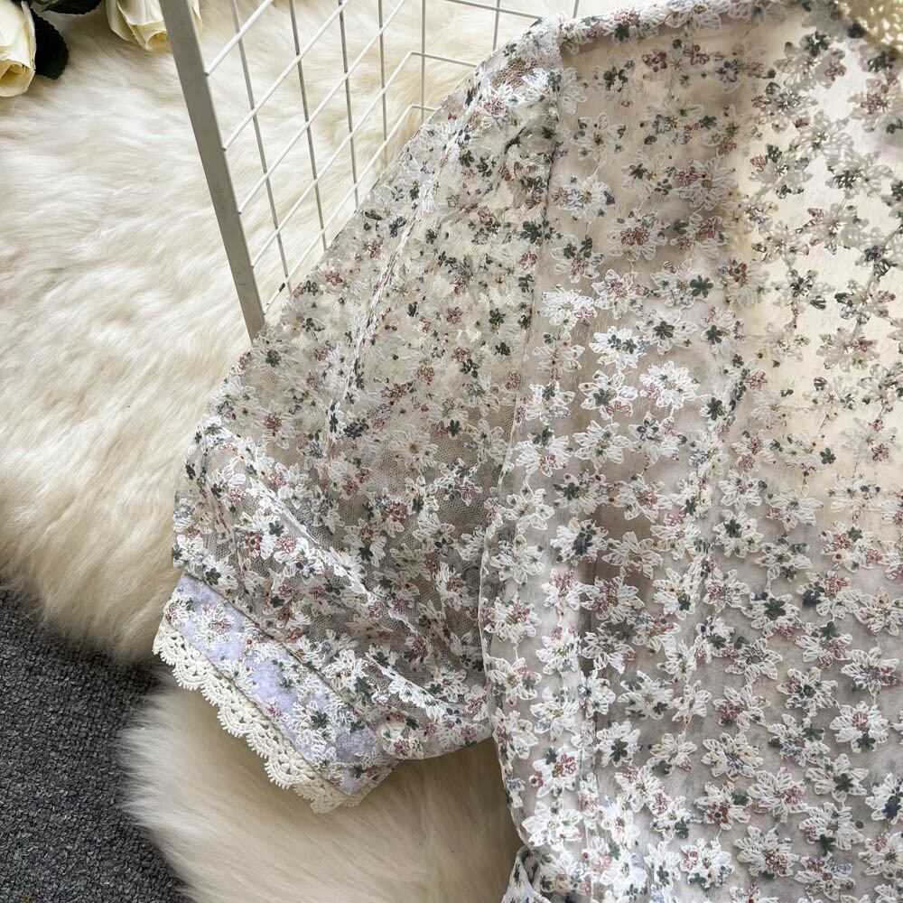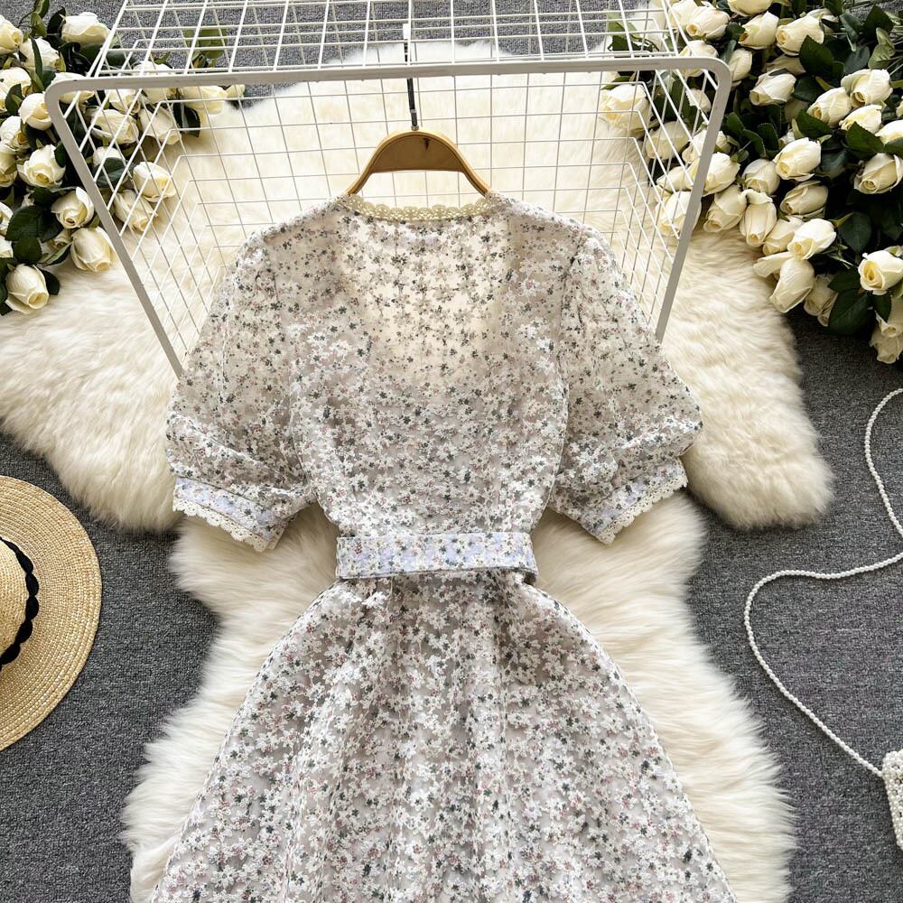 優しい気質レトロフローラルレースステッチVネックワンピースフレンチファーストラブスウィート半袖ウエストAラインスカート 大人ガーリー キュート カジュアル 花柄 lyxaj96402691289
