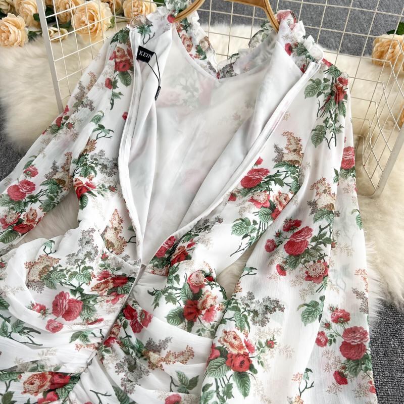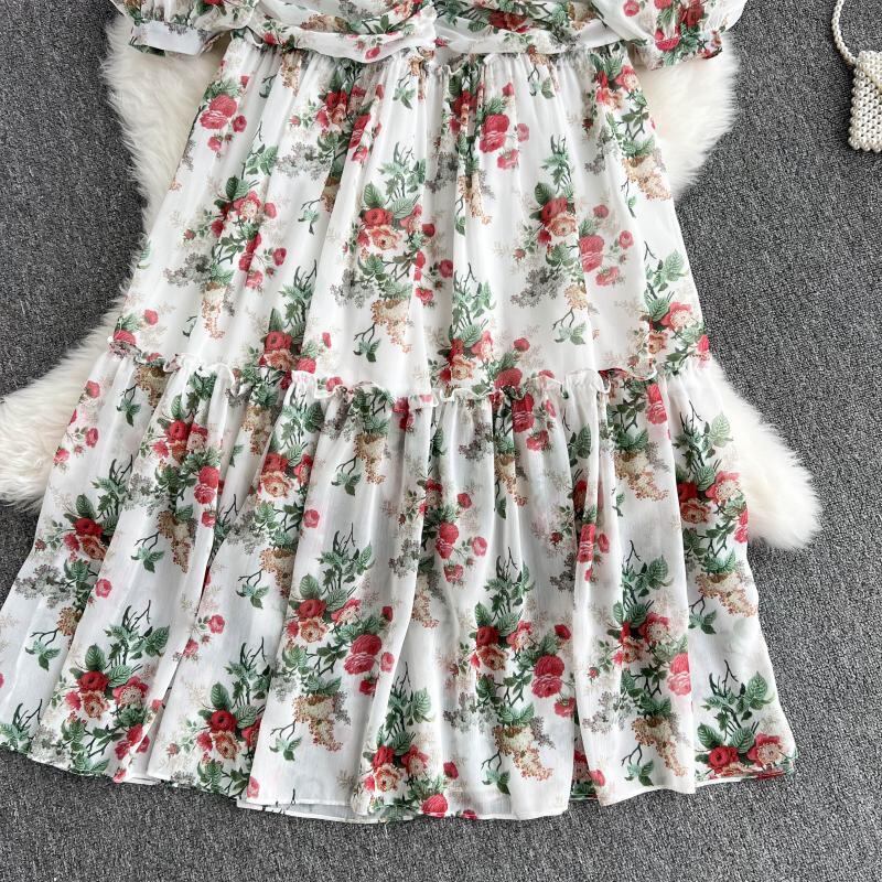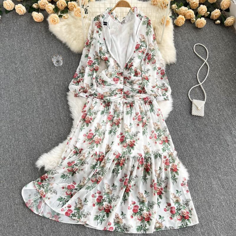 夏の蓮の葉の襟のランタン袖プリーツバックジッパーウエストロングスカート女性のプリントルーズプリーツドレス ランタンスリーブ サマー 夏物 lyxaj59329129636