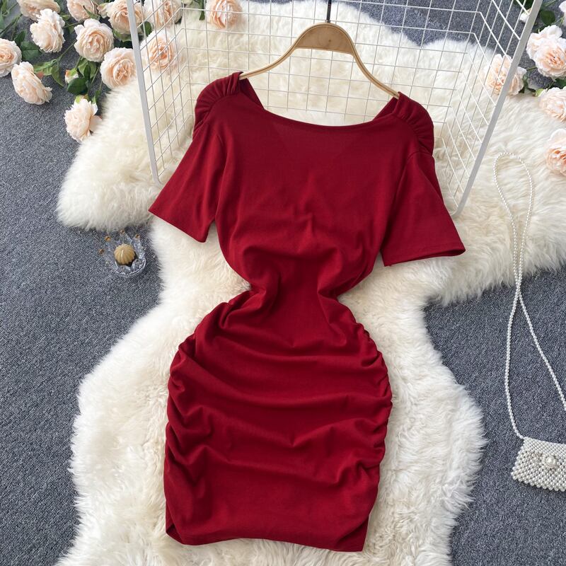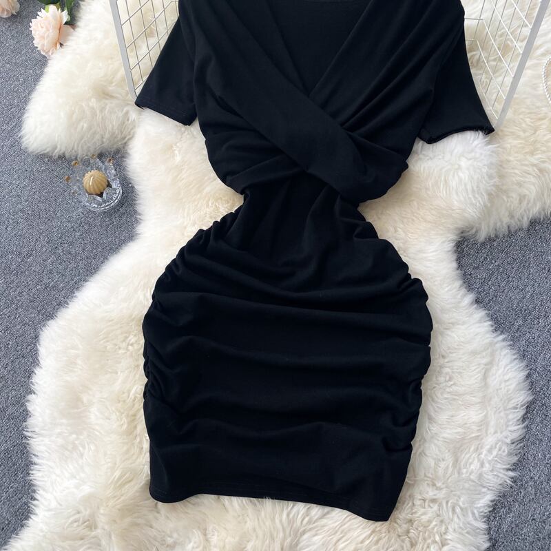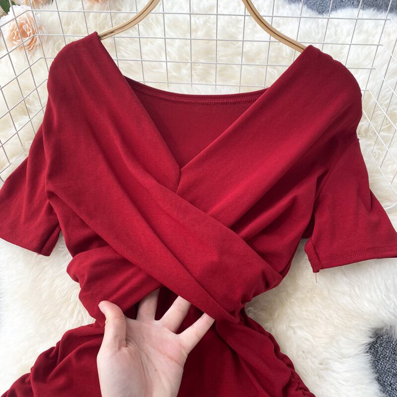2022年夏の新しいプリーツセクシーレディースVネックスリムバッグヒップウエスト半袖スモールドレスショートスカートドレス サマー 夏物 lyxaj85750643469