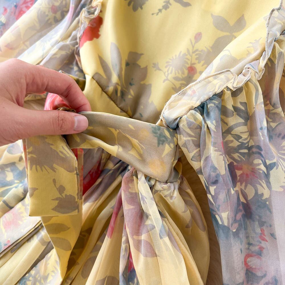 バケーションスタイルのディープVネックランタンスリーブプリーツロングスカート早春優しいスタイルティーブレイクフレンチオイルペインティングドレス スプリング 春物 lyxaj108479830