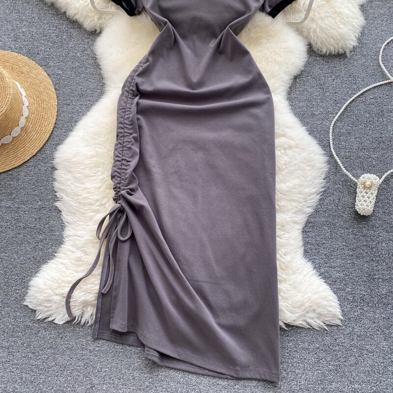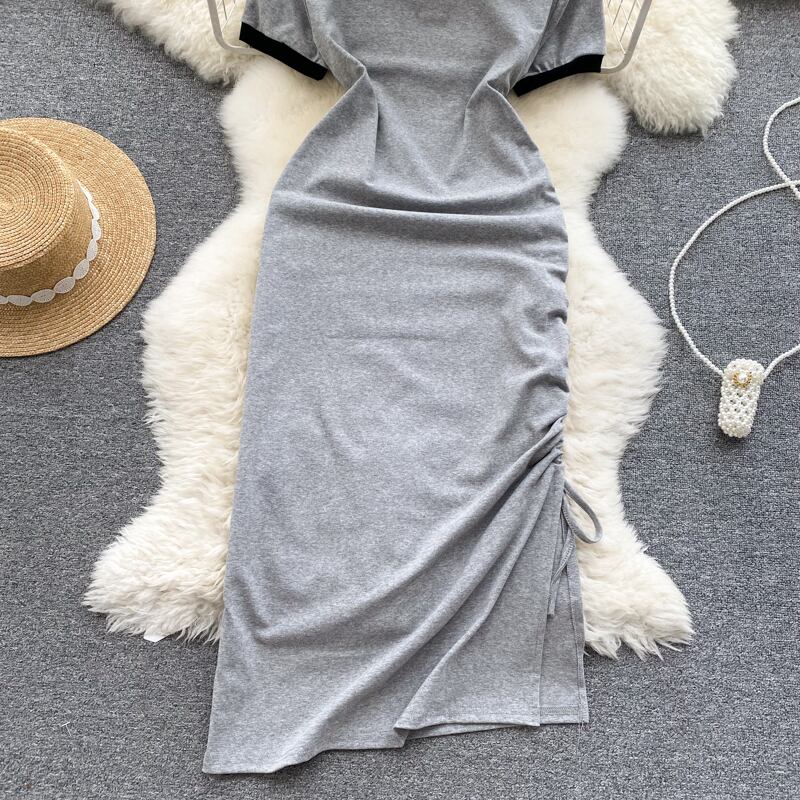 気質ポロカラードレスの韓国版女性の2022年夏の新しいスリムフィットと薄いプリーツスリットバッグヒップミドルスカート サマー 夏物 lyxaj34912214900
