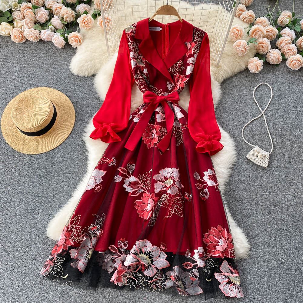 2021年秋冬新作スーツ衿気質重工業刺繡ドレス女性威厳のある赤いロングドレススカート レッド 刺繍 オータム 秋物 ウィンター 冬物 lyxaj13207271430