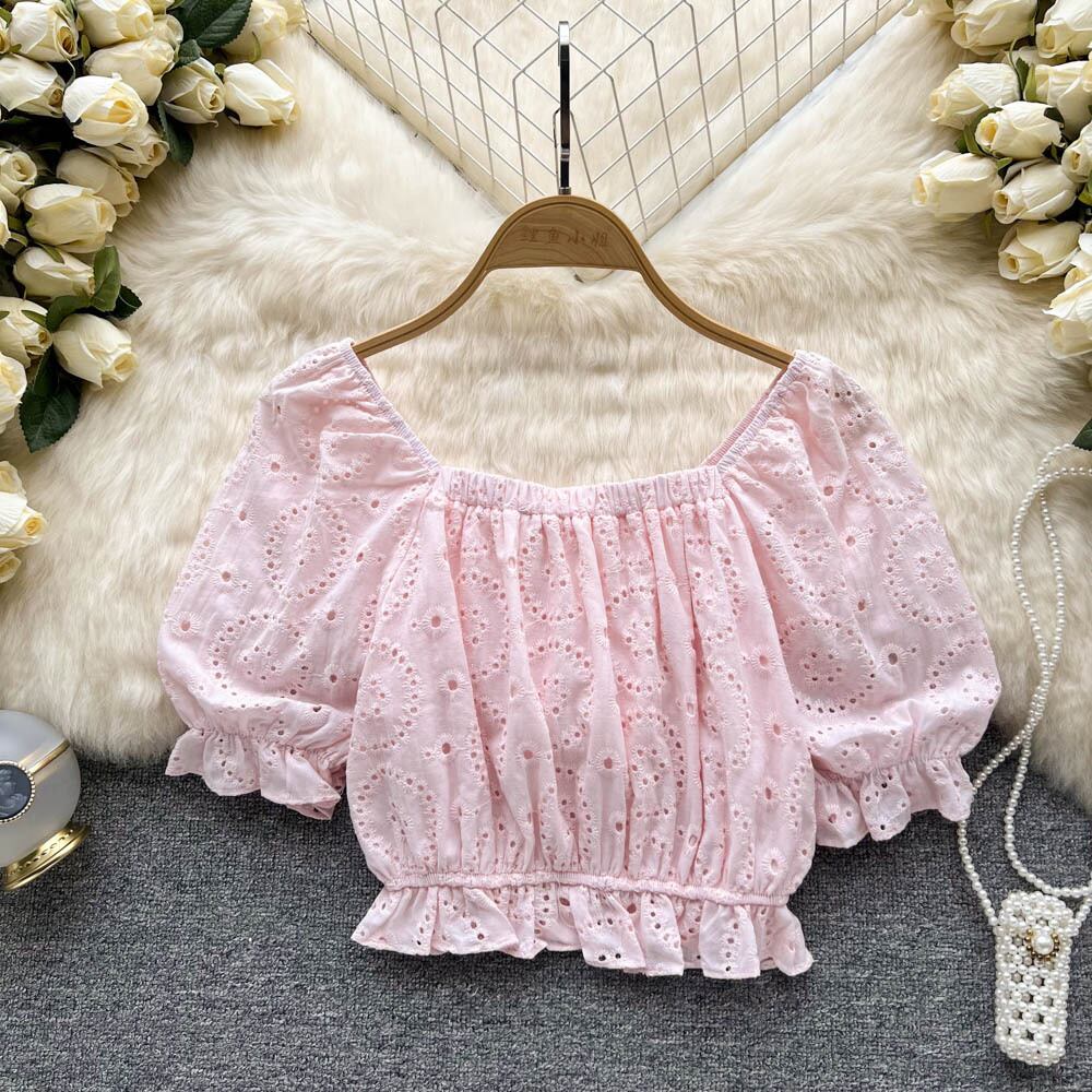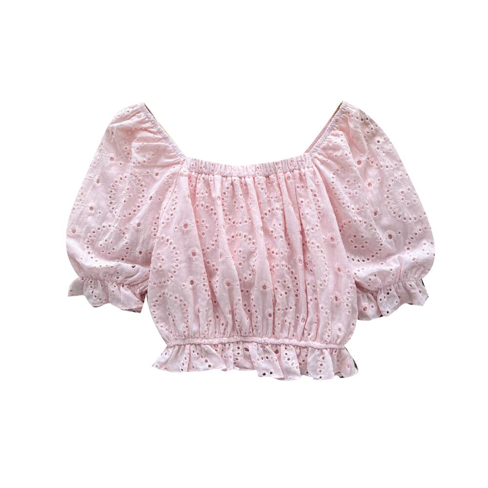 夏の新作韓国版オールマッチスキームホロープリーツレーススクエアネックプリントウエスト半袖シフォンシャツレディーストップス サマー 夏物 スクウェア lyxaj21003220955