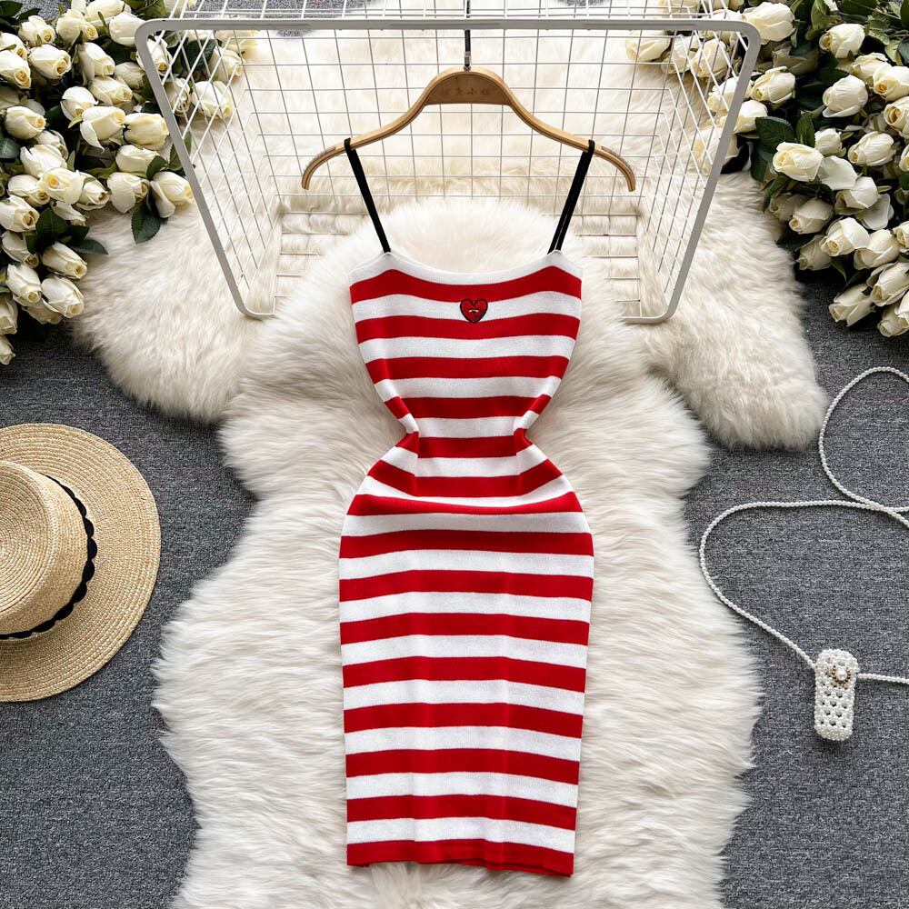 ストライプのニットドレスの女性の夏の新しいホットな女の子のセクシーなスリムスリムでシックなバッグヒップサスペンダースカートが大好きです サマー 夏物 lyxaj7174880388