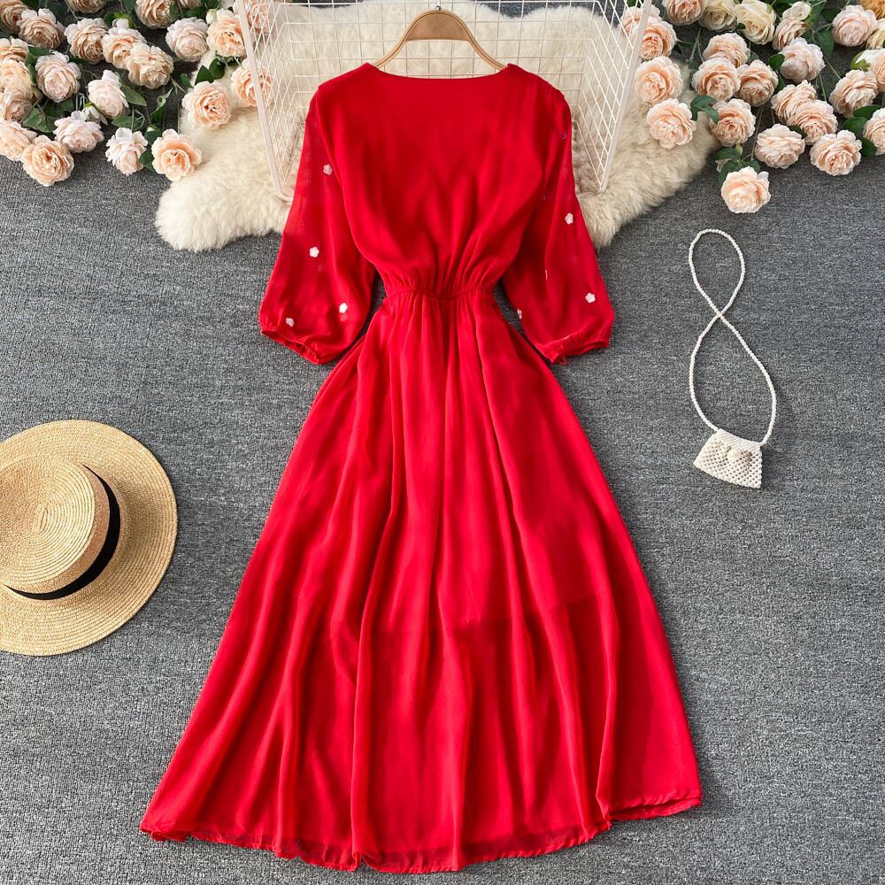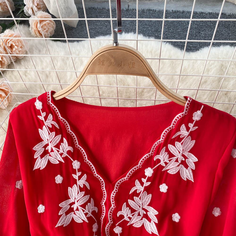 重工業刺繡Vネックシフォンドレスハイウエストシンスーパーフェアリーテンペラメントラージスイングロングスカートシーサイドトラベルシューティングホリデースカート ハイウェスト 刺繍 Vネック lyxaj88433927558