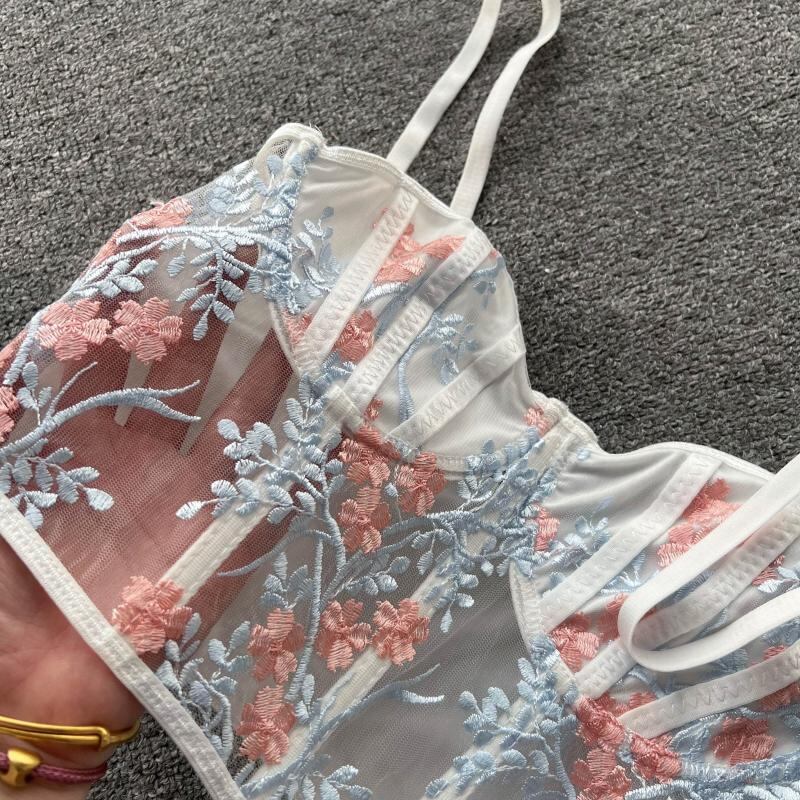 2022年夏のデザインセンスフレンチセクシー刺繡サスペンダーメッシュレーススモールシャツ女性の純粋な欲望ホットガールショートトップ 刺繍 サマー 夏物 ピュア lyxaj65081200807