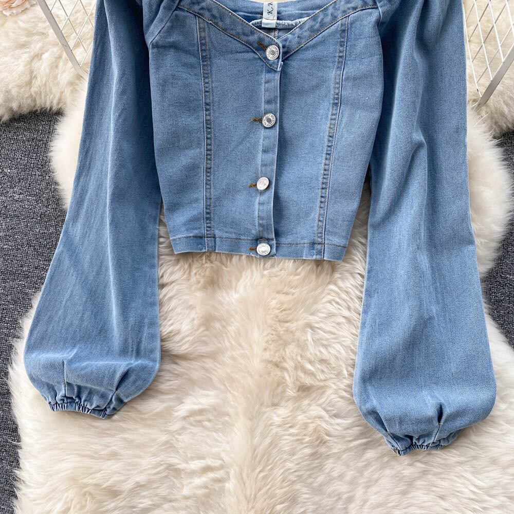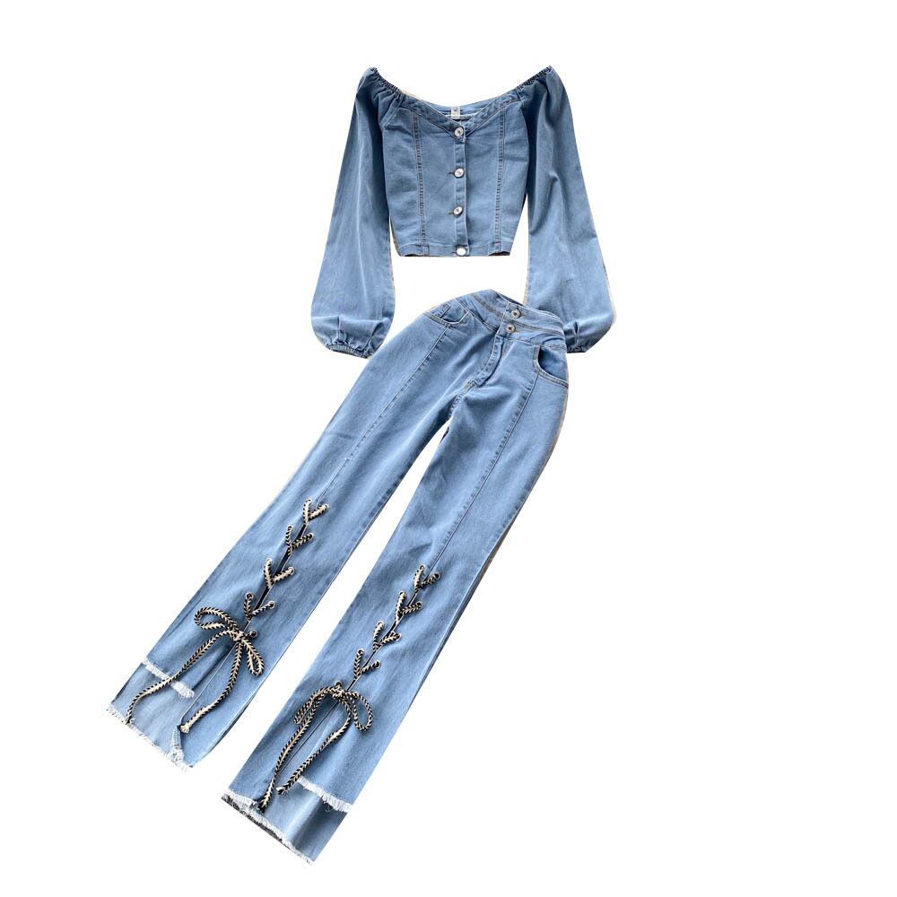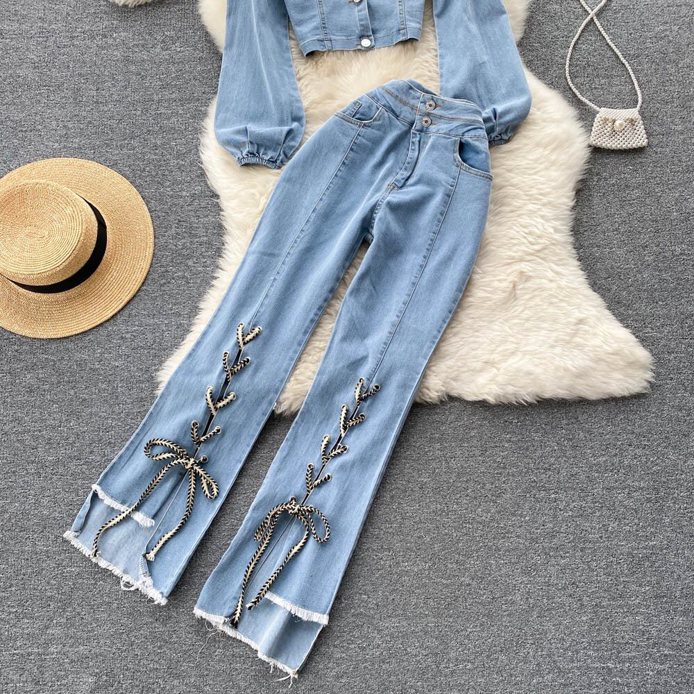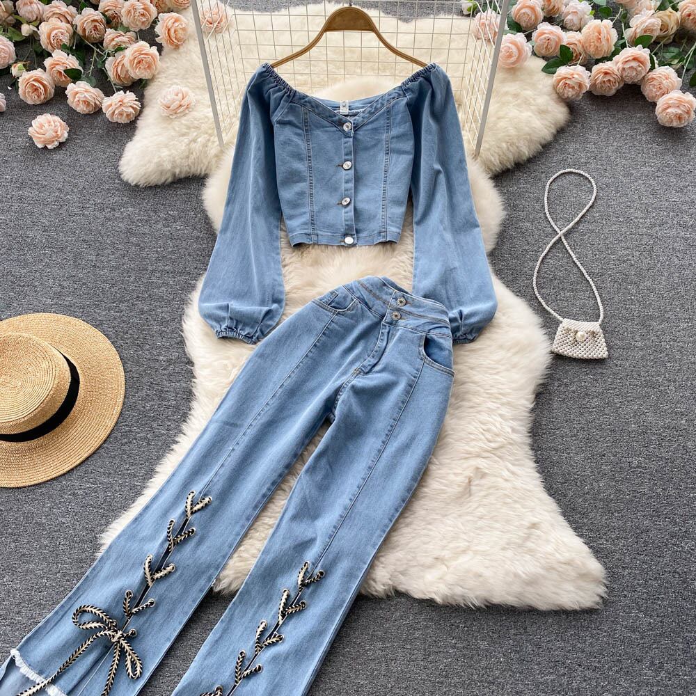 2022年春夏新作ワンワードカラー長袖ショートデニムトップハイウエストデザインマイクロフレアパンツツーピーススーツ ロング スプリング 春物 サマー 夏物 lyxaj47054519750
