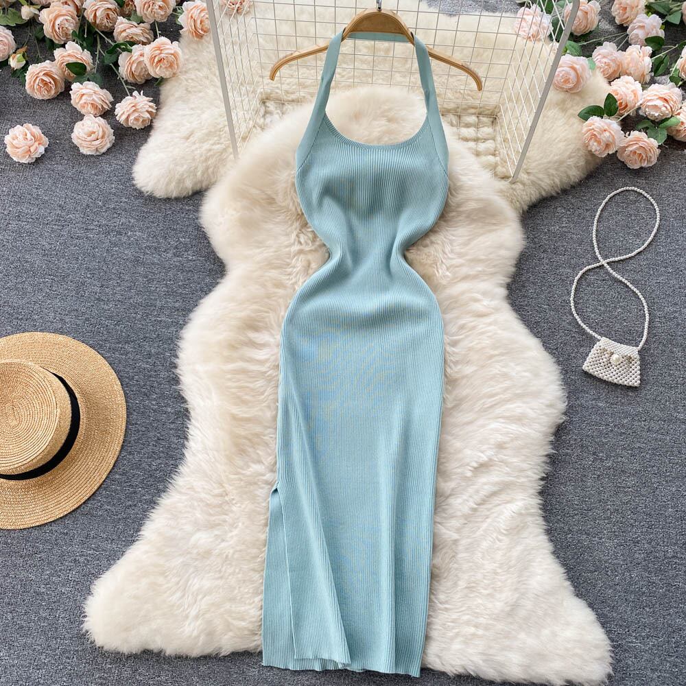 フランスのホットな女の子のスタイルの純粋な欲望ニットホルターネックドレス女性の襟セクシーな露出したバックパックのお尻スプリットソリッドカラーロングスカート リュック ピュア lyxaj49709059367