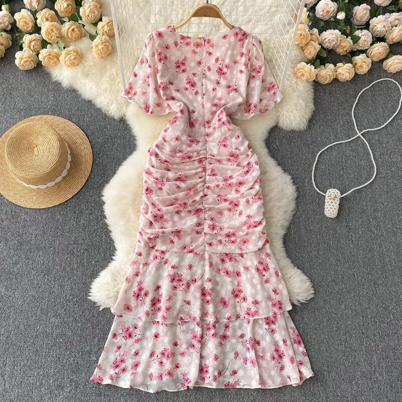 巾着プリーツワンピースサマースリムVネック半袖スカートウエストフローラルシフォンフェアリーフィッシュテールロングスカート 夏物 花柄 lyxaj2804825191