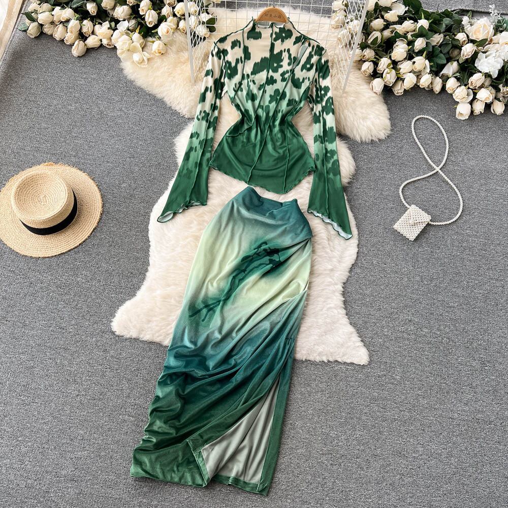 ヨーロッパとアメリカのファッションの新しいグラデーションカラー印刷スリムフィットと薄いスタンドアップカラートップハイウエストスカートツーピーススーツ ハイウェスト lyxaj92378038184