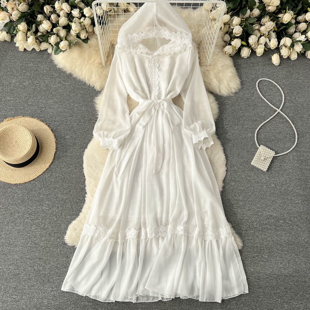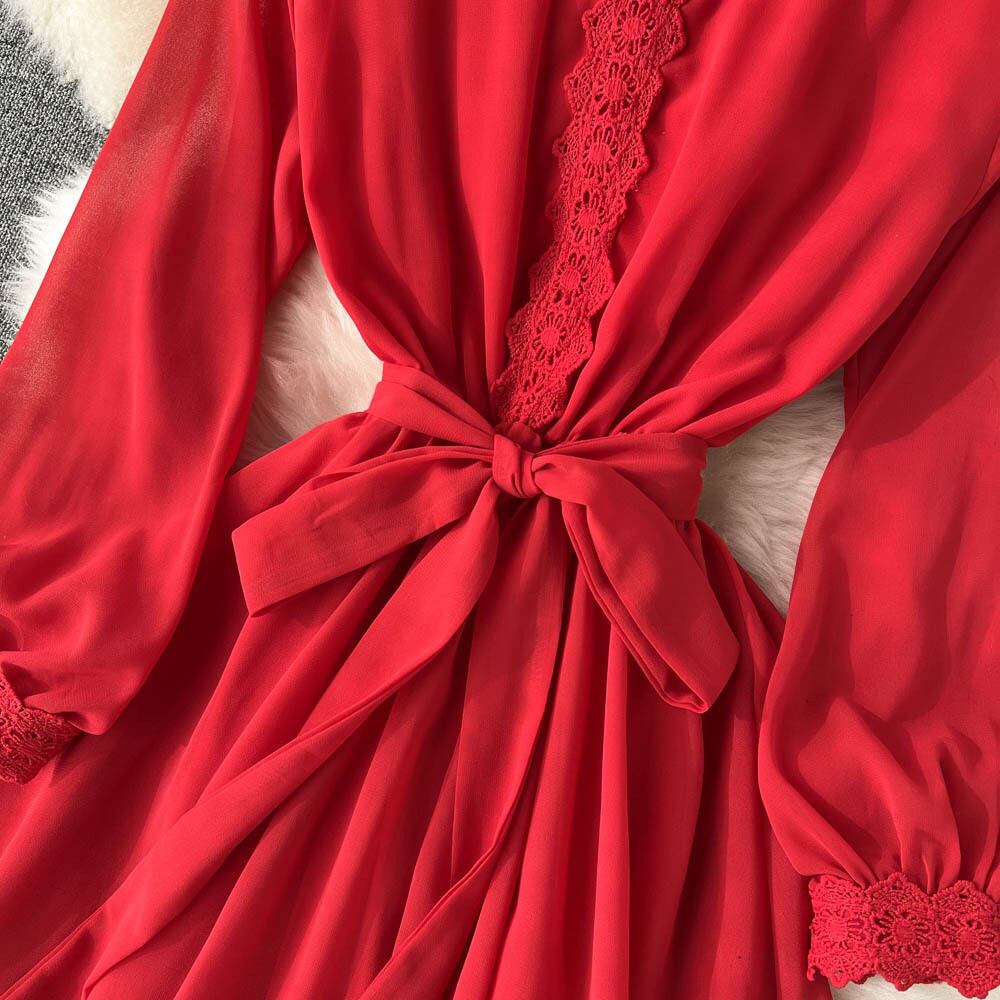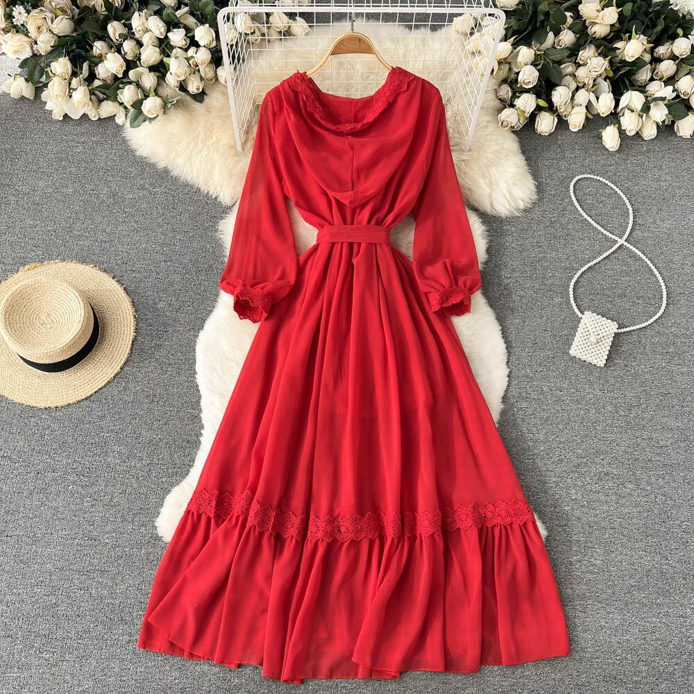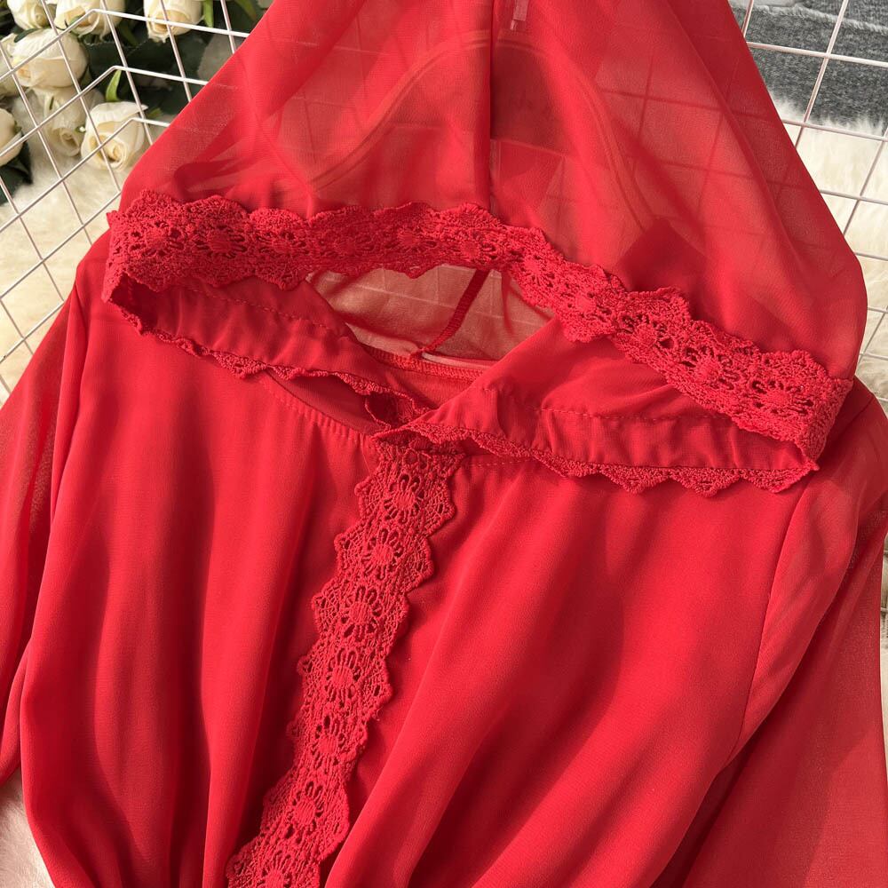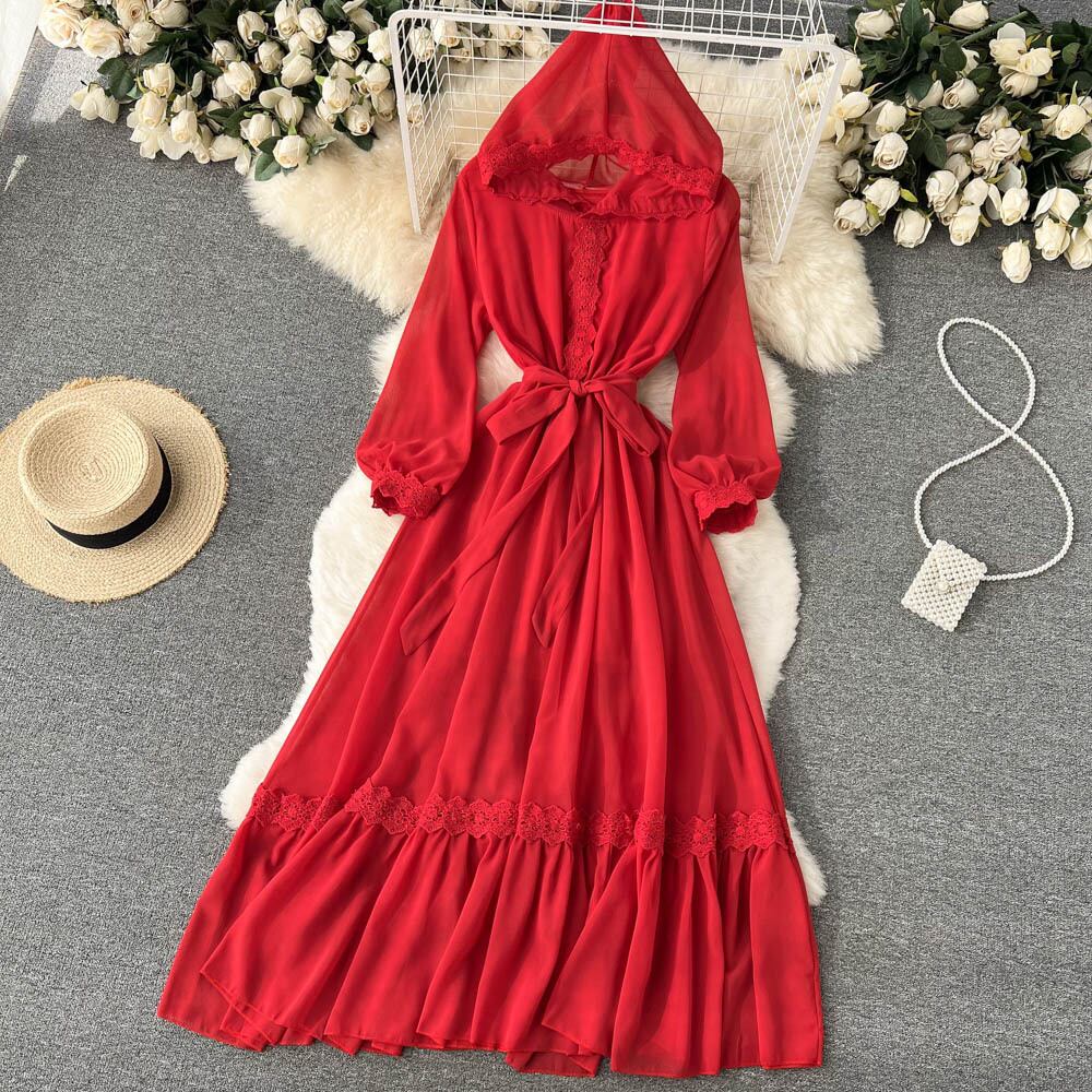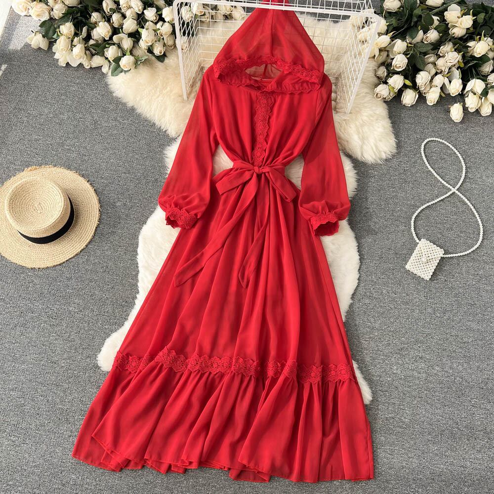 旅行休暇赤エレガントビッグスイングロングスカートレースウエスト薄いレースステッチシフォンフード付きドレス レッド lyxaj67213353943