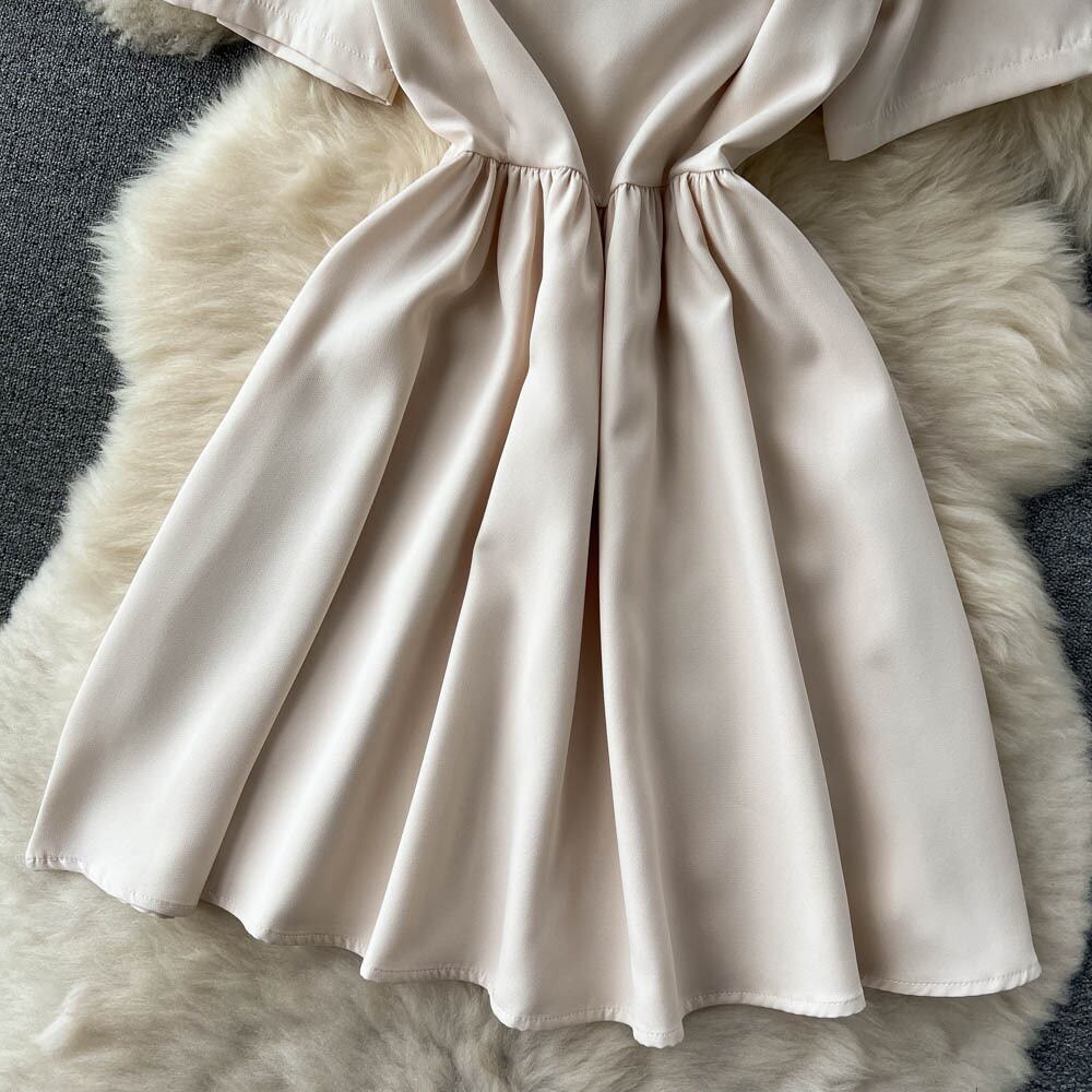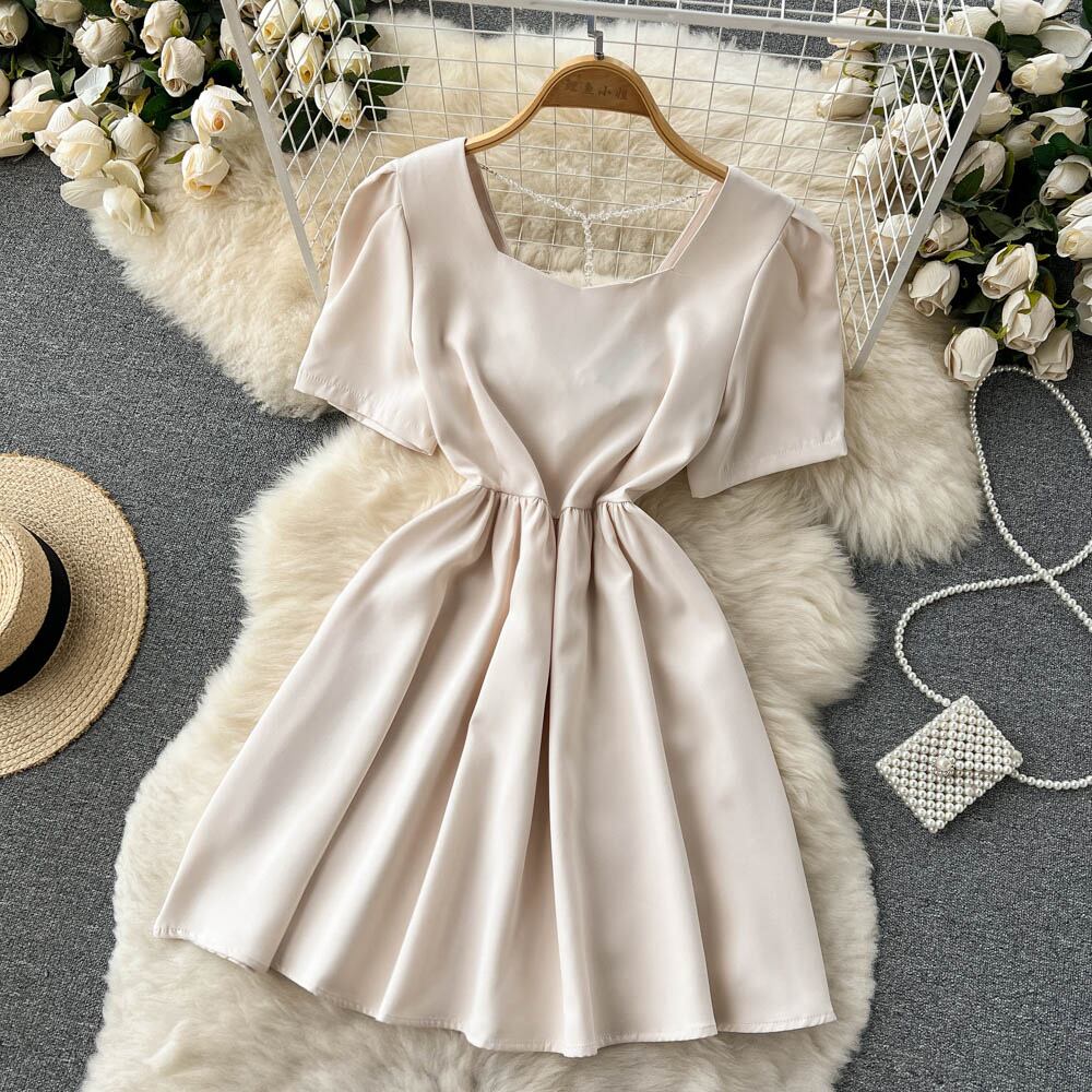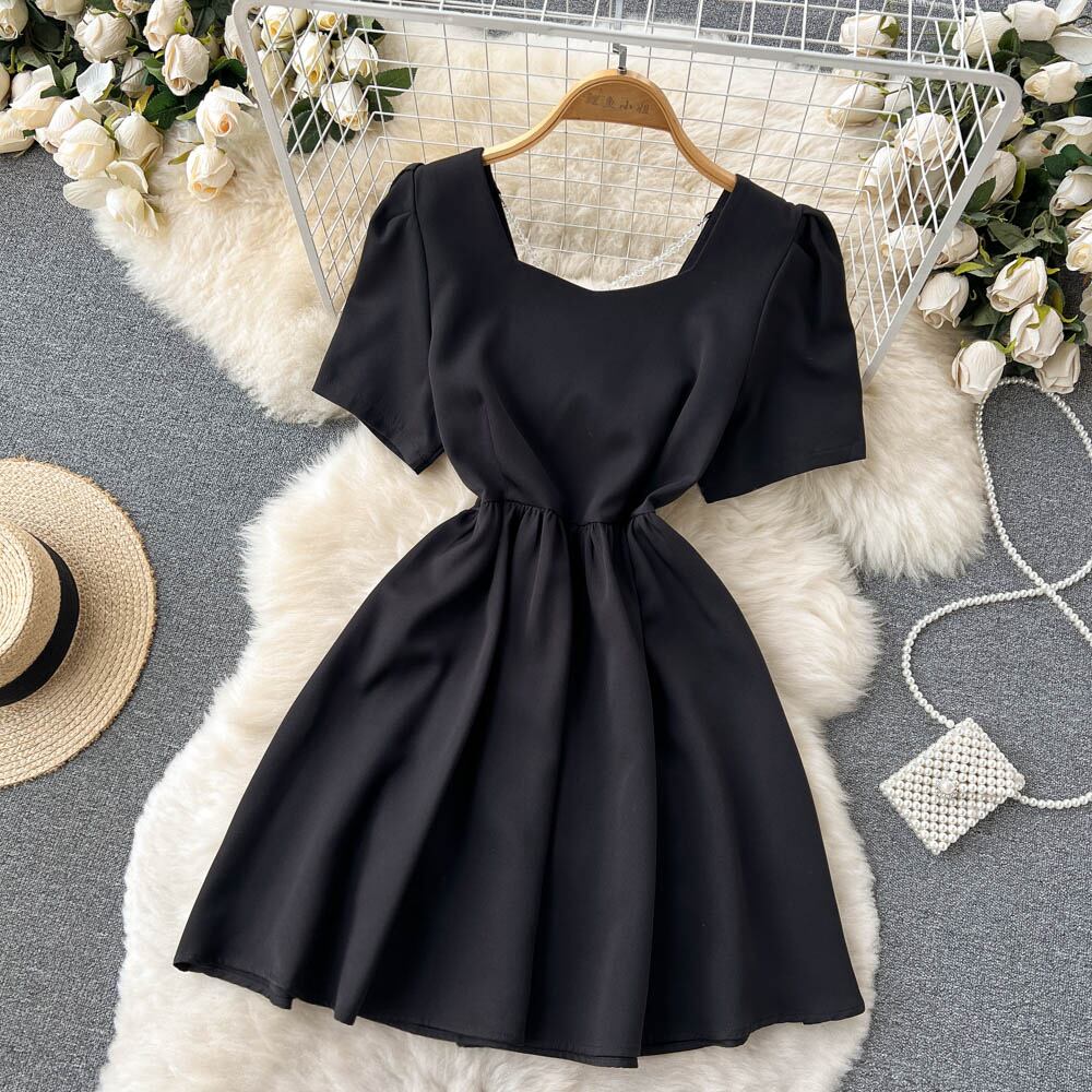 夏の新しいスタイルの甘い気質露出鎖骨ハイウエスト細いウエストふくらんでいるスカート小さなフレンチドレス女性 ハイウェスト 大人ガーリー スウィート キュート カジュアル サマー 夏物 lyxaj89129521985