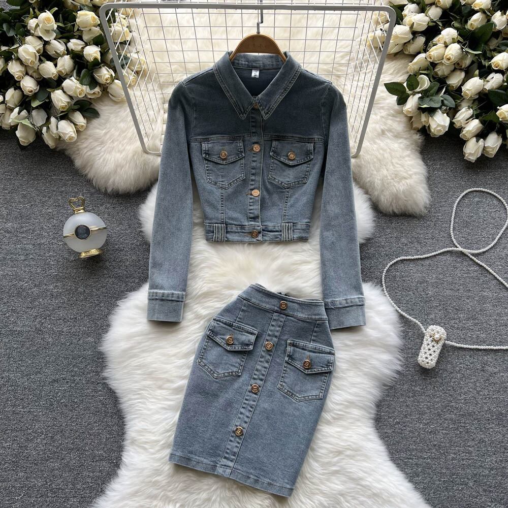 香港スタイルのレトロスーツスカート女性韓国版ショートネーブルカーディガンデニムジャケットハイウエストバッグヒップデニムショートスカートツーピース ハイウェスト lyxaj53672915310