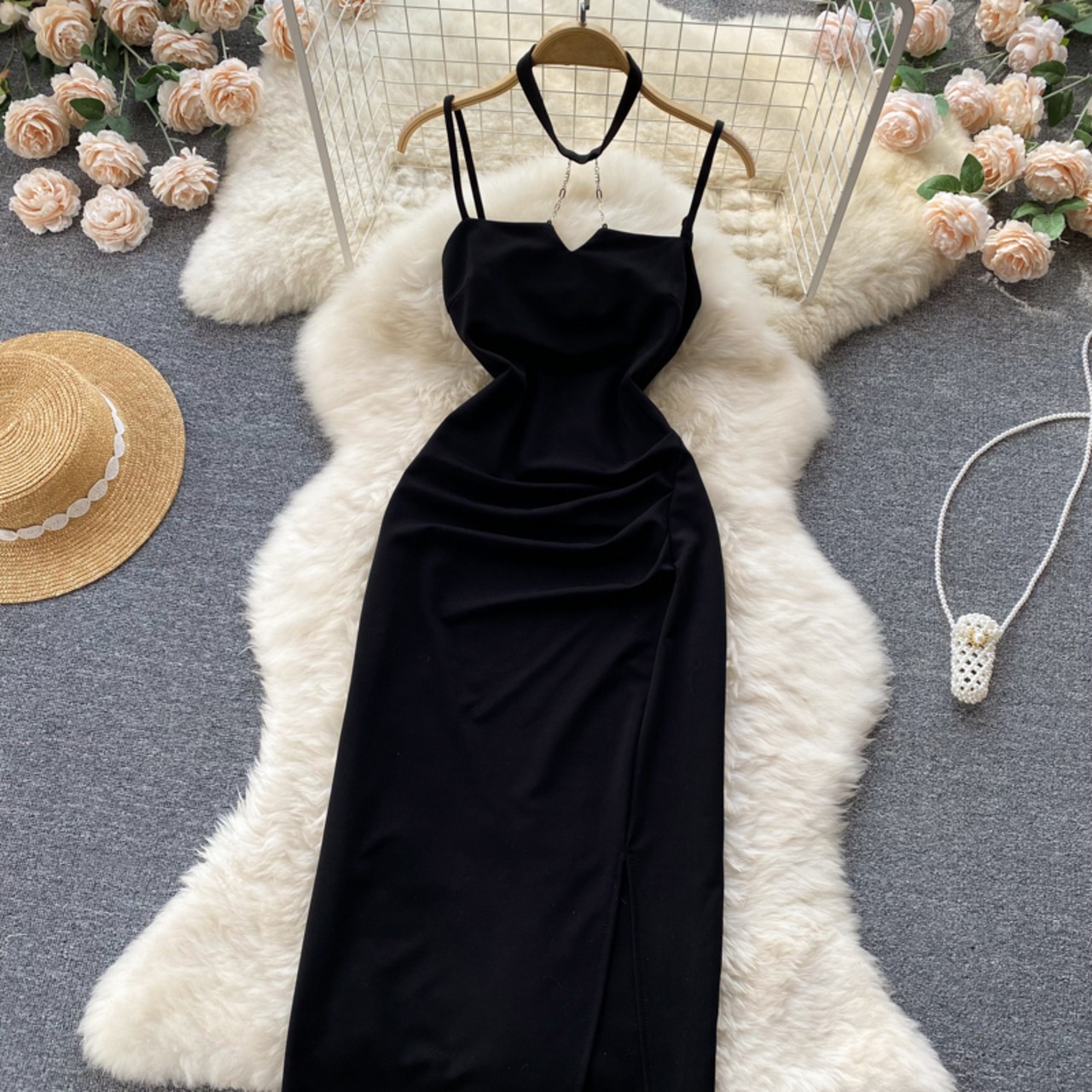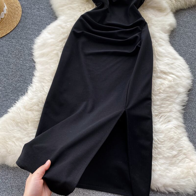 ホルターネックデザインサスペンダースカートファッション女性気質オフショルダー折り目不規則なミドル丈ドレスリトルブラックドレス lyxaj55330935315