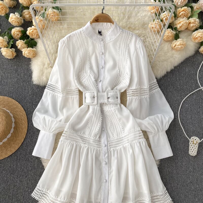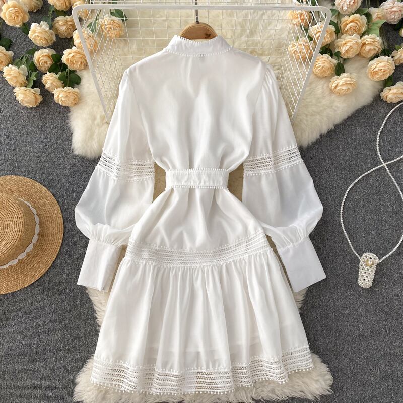レースステッチのランタンスリーブ春の女性フランスの気質長袖ルーズで薄いフリルの小さなドレス ロング スプリング 春物 lyxaj47938969195