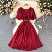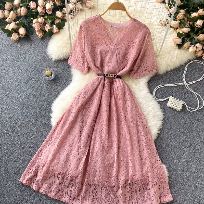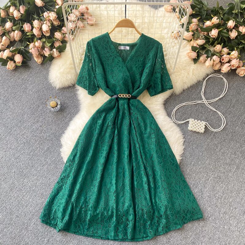 フレンチニッチ半袖ワンピースサマーデザイン不規則なVネックネクタイウエストシンルーズラージスイングスカート 夏物 lyxaj78423908434