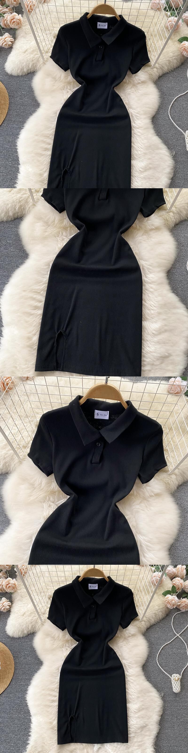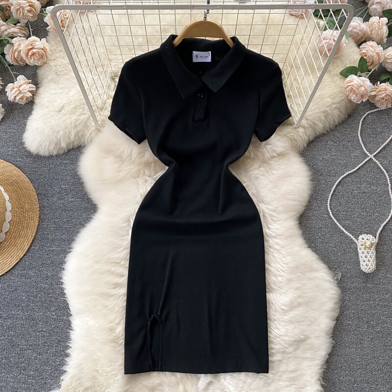 夏の新しいシックなライトおなじみのスタイルのポロカラーシャツニットドレスミドル丈ウエストウエストスリムスリットスカート サマー 夏物 lyxaj47258675037
