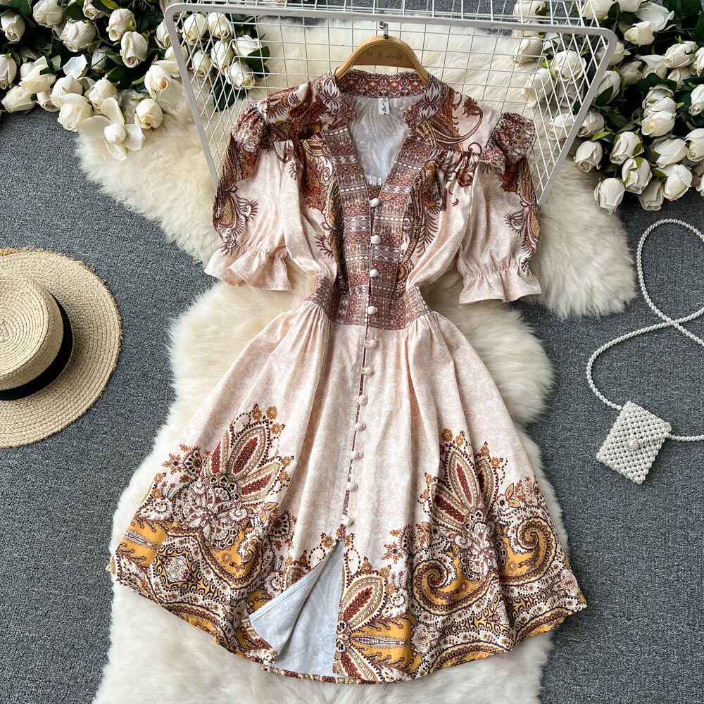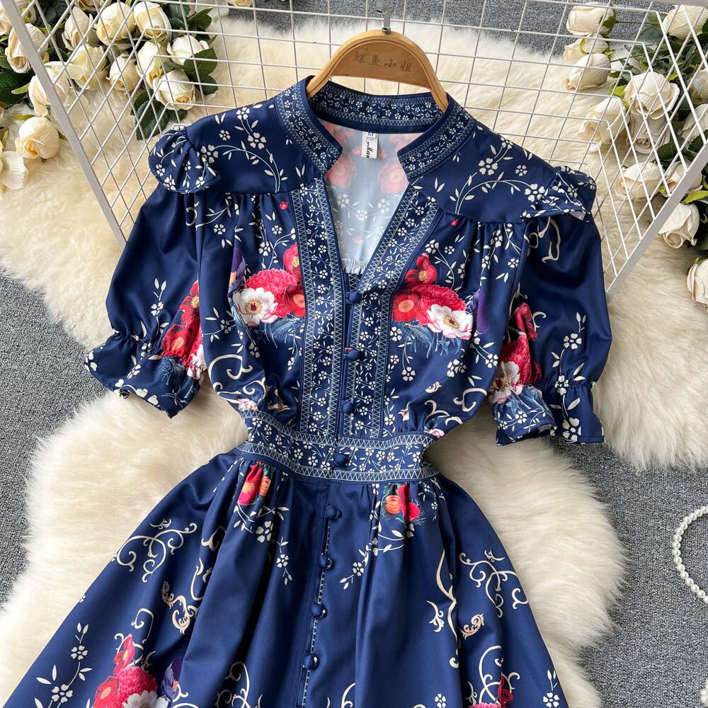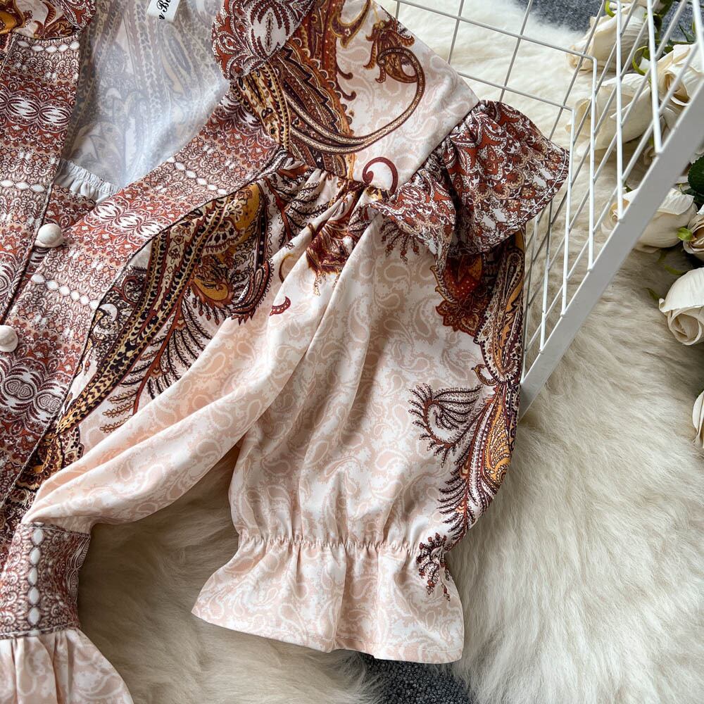 ファッショナブルなシングルブレストのレトロなVネックトランペット半袖コートスタイルのヨーロッパとアメリカの新しいミドル丈のふくらんでいるプリントドレス ヨーロピアン lyxaj66510286831