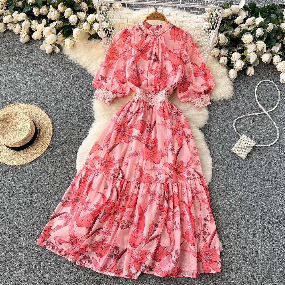 5点袖、ウエスト、スリム、ふわふわ、ビッグスイング、プリンセススタイル、プリント気質プリーツドレス、女性の膝丈の気質ロングスカート lyxaj67098283619