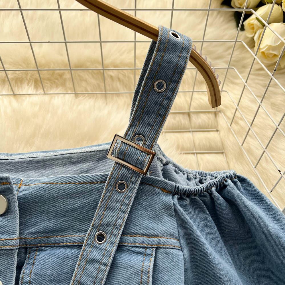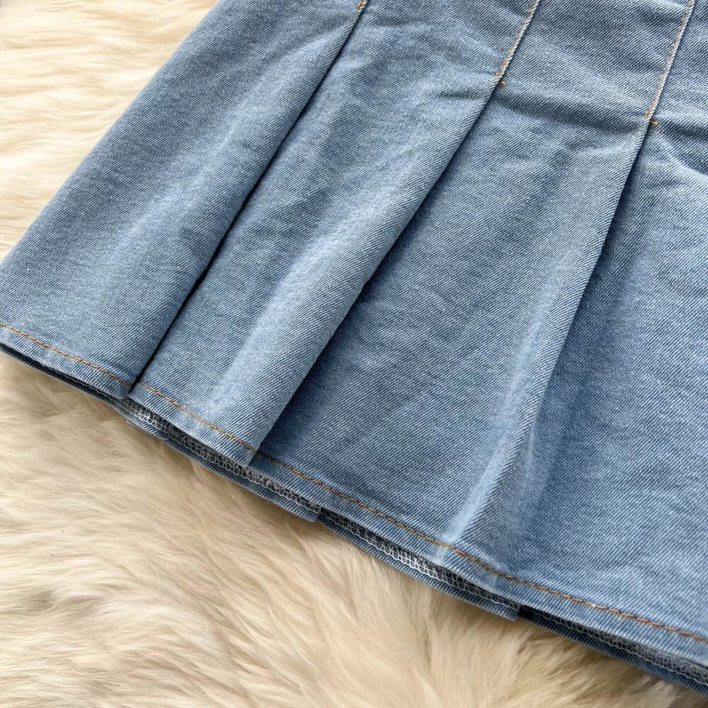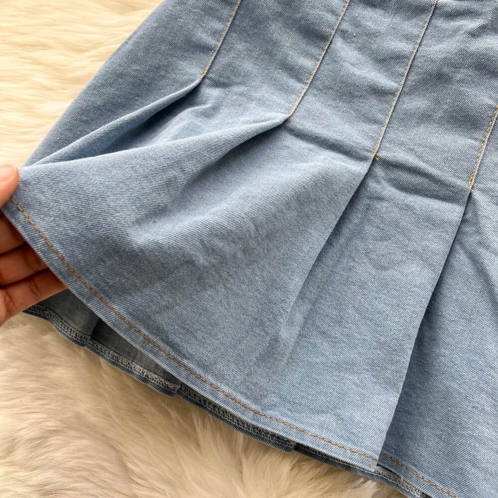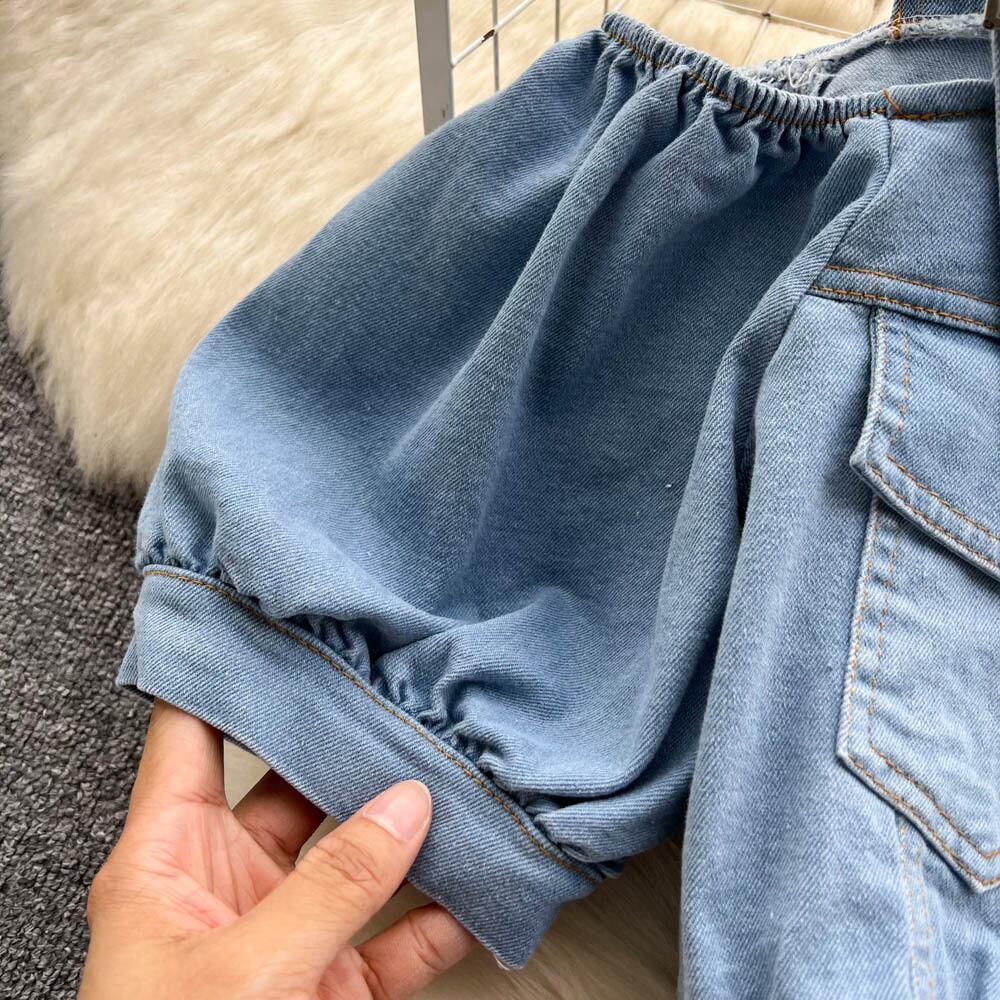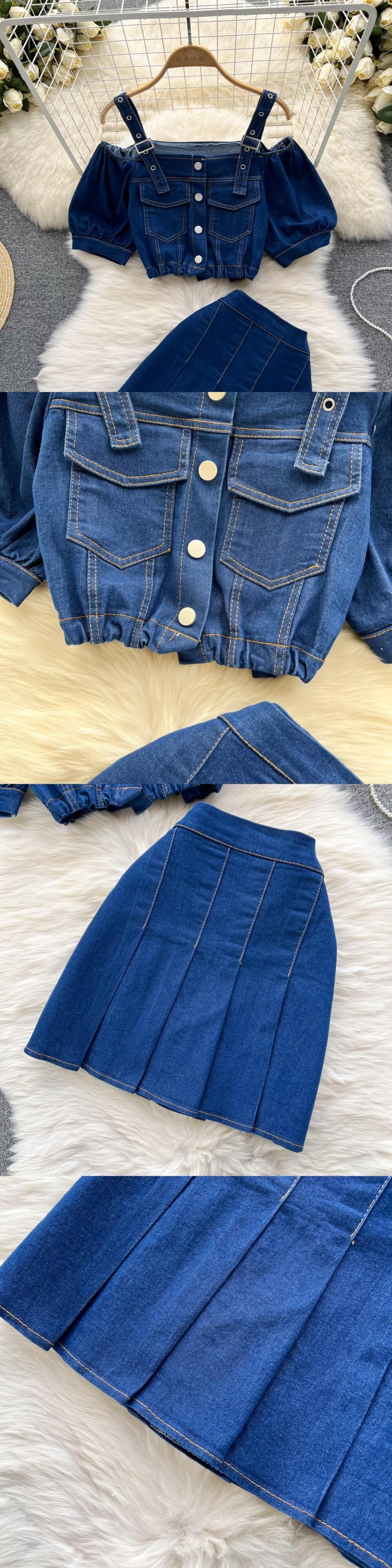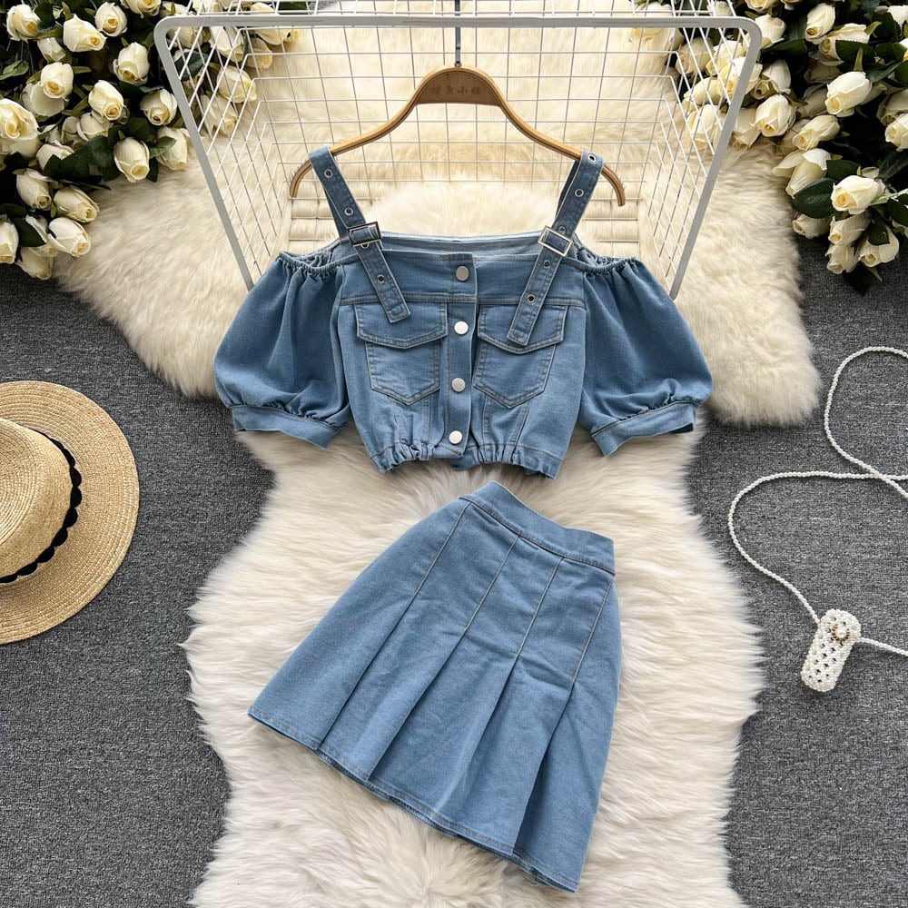 フレンチバブル半袖デザインセンススーツオフショルダーショートウエスタンスタイルデニムシャツプリーツショートスカートツーピースセット ハーフスリーブ lyxaj10852583827