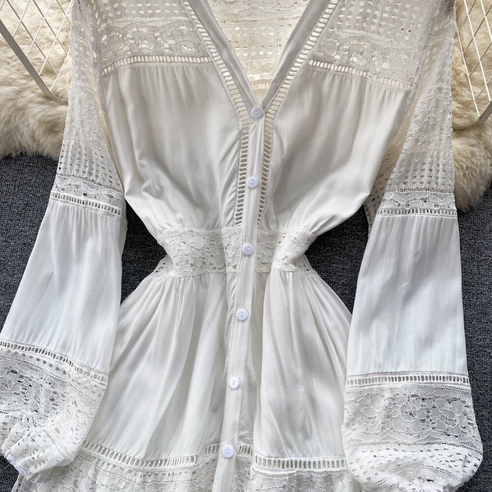夏のフレンチスウィートファーストラブホワイトハイエンドVネックドレスウエストと細い気質ロングスーパーフェアリーホリデードレス 大人ガーリー キュート カジュアル サマー 夏物 lyxaj94059850305
