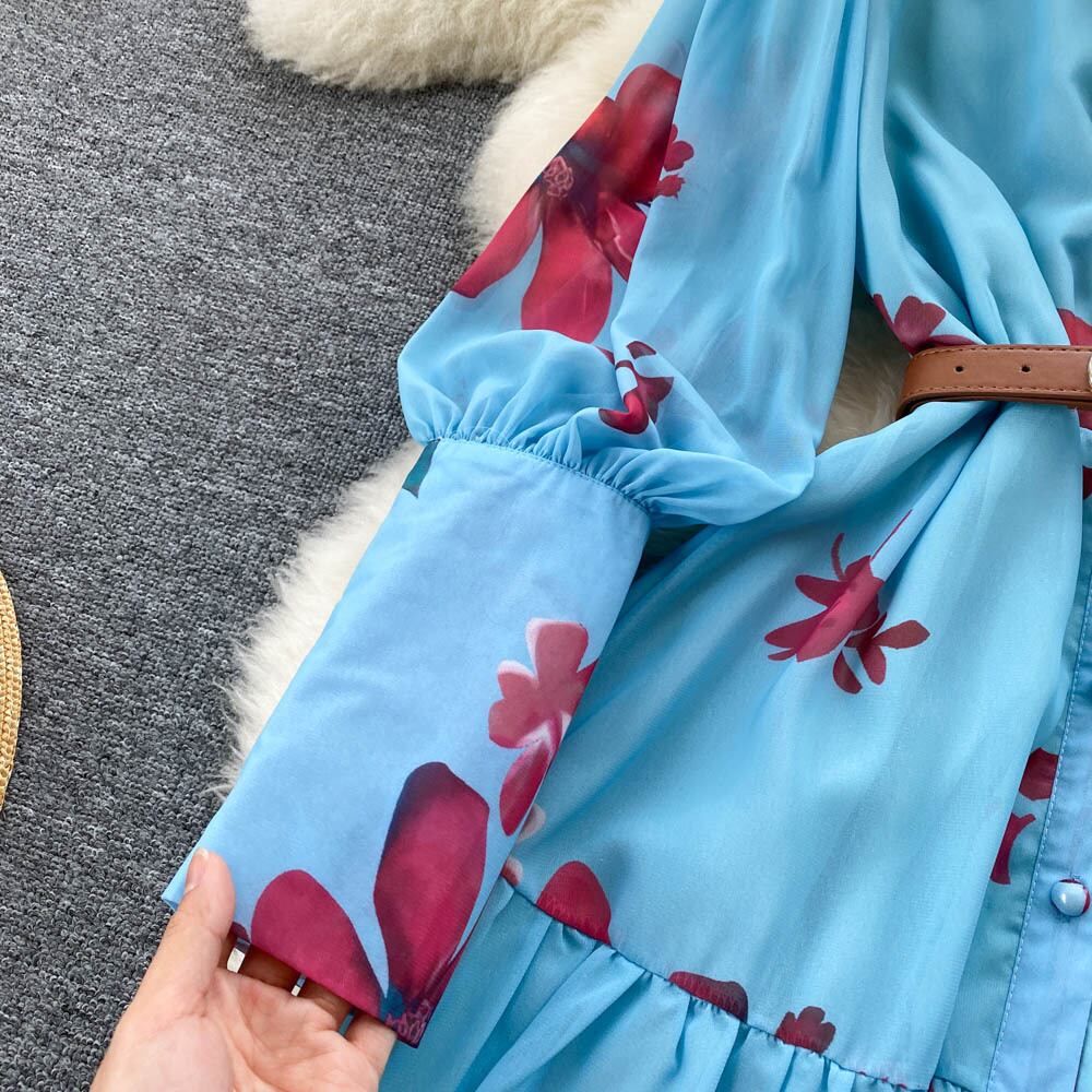 春の新作プリントVネックランタンスリーブシングルブレストウエストシフォンドレスレディースボヘミアンドレス スプリング 春物 lyxaj18718102642