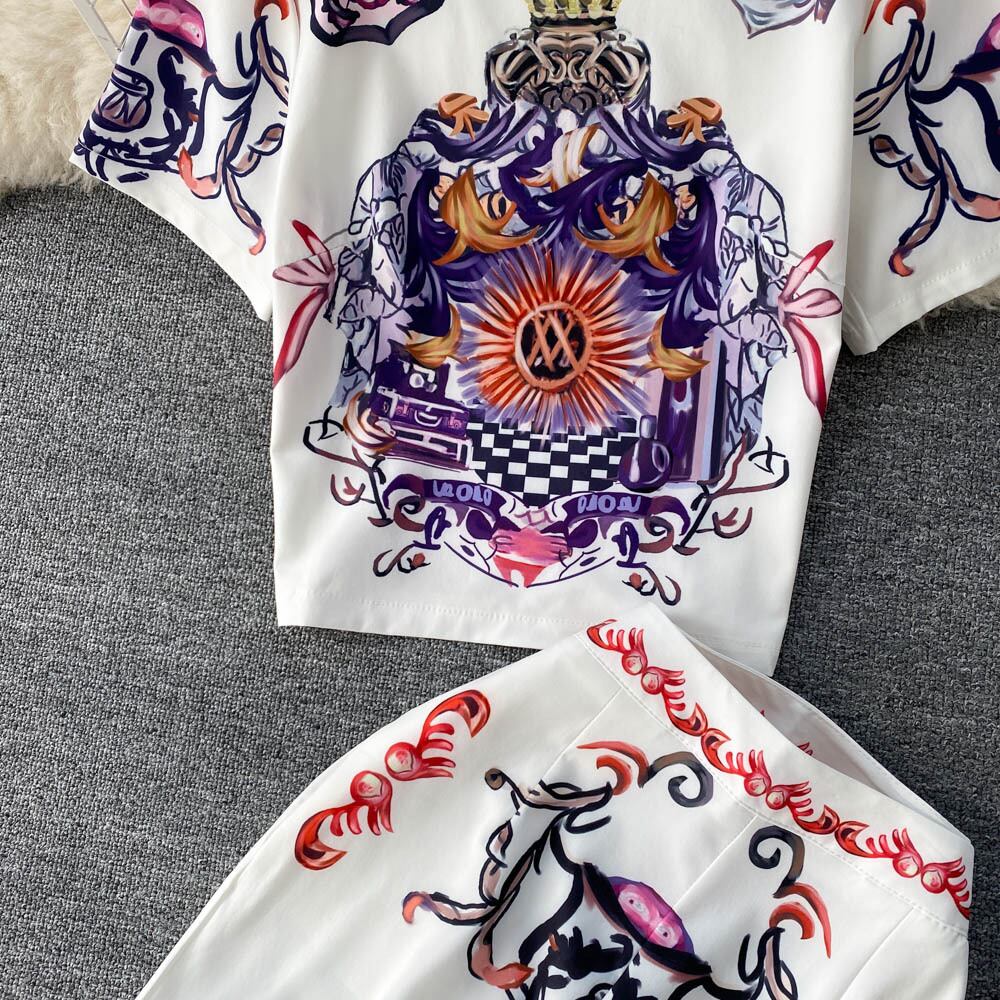 ヨーロッパとアメリカのパーソナライズされた印刷ファッションスーツ女性の半袖ショーツルーズフォーリンスタイルトップスストレートレッグパンツカジュアルパンツツーピースセット ブルマー ヨーロピアン lyxaj27997500065