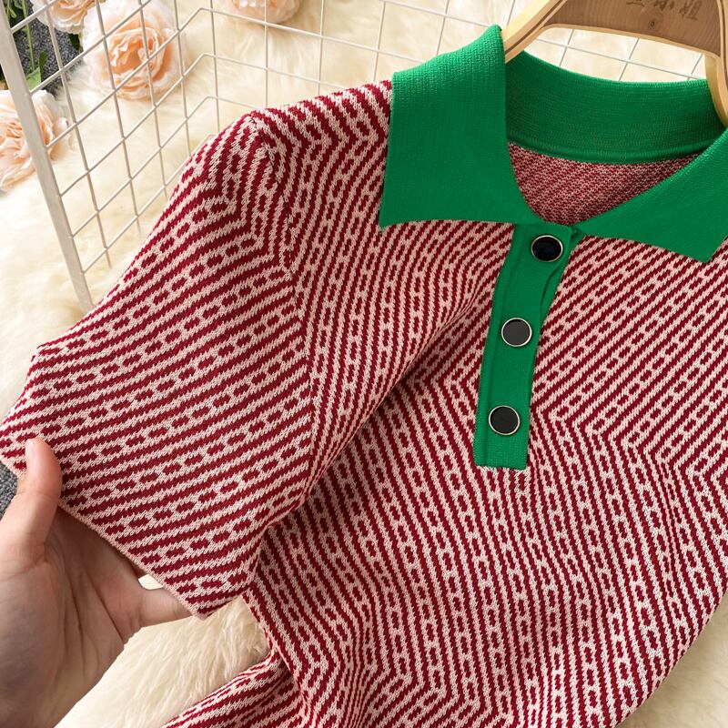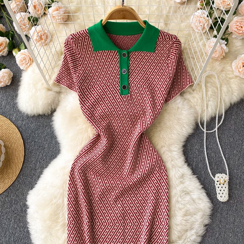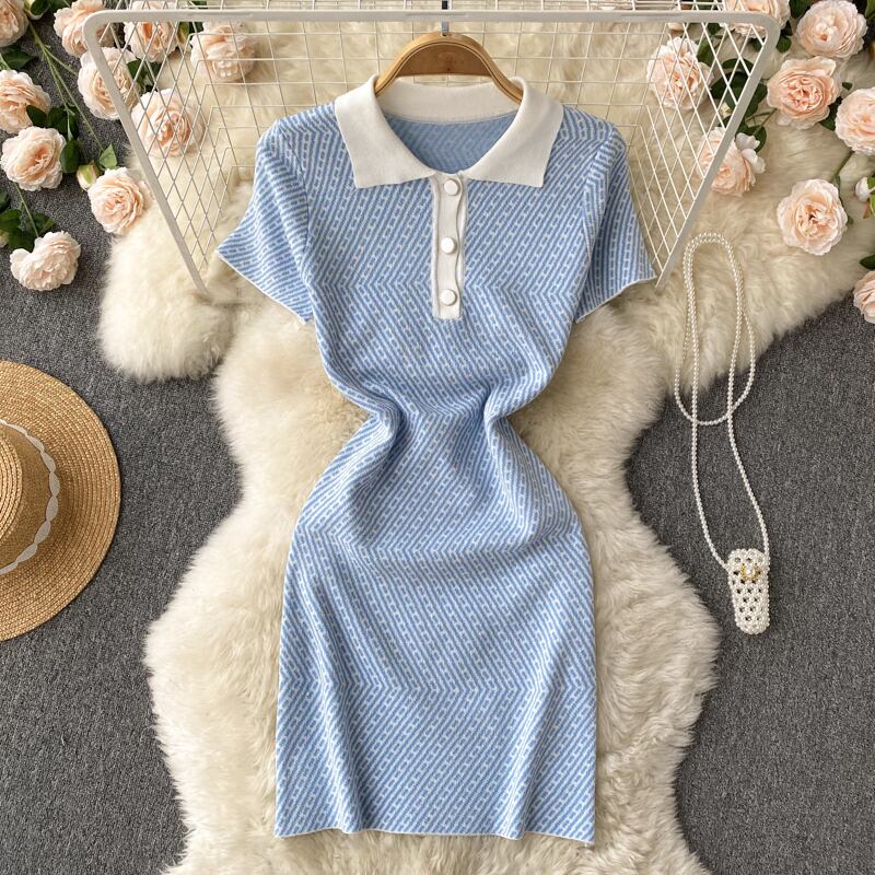 夏の新デザインひし形チェック柄半袖ポロカラーコントラストカラーニットワンピースレディーススリムスリミングヒップスカート サマー 夏物 lyxaj14582337666