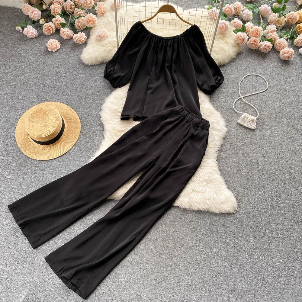 ヨーロピアンスタイルとアメリカンスタイルのレディース露出鎖骨ワンショルダープリーツ半袖トップスレディースハイウエストカジュアルストレートワイドレッグパンツツーピースセット ハイウェスト ワイドパンツ lyxaj33714166360