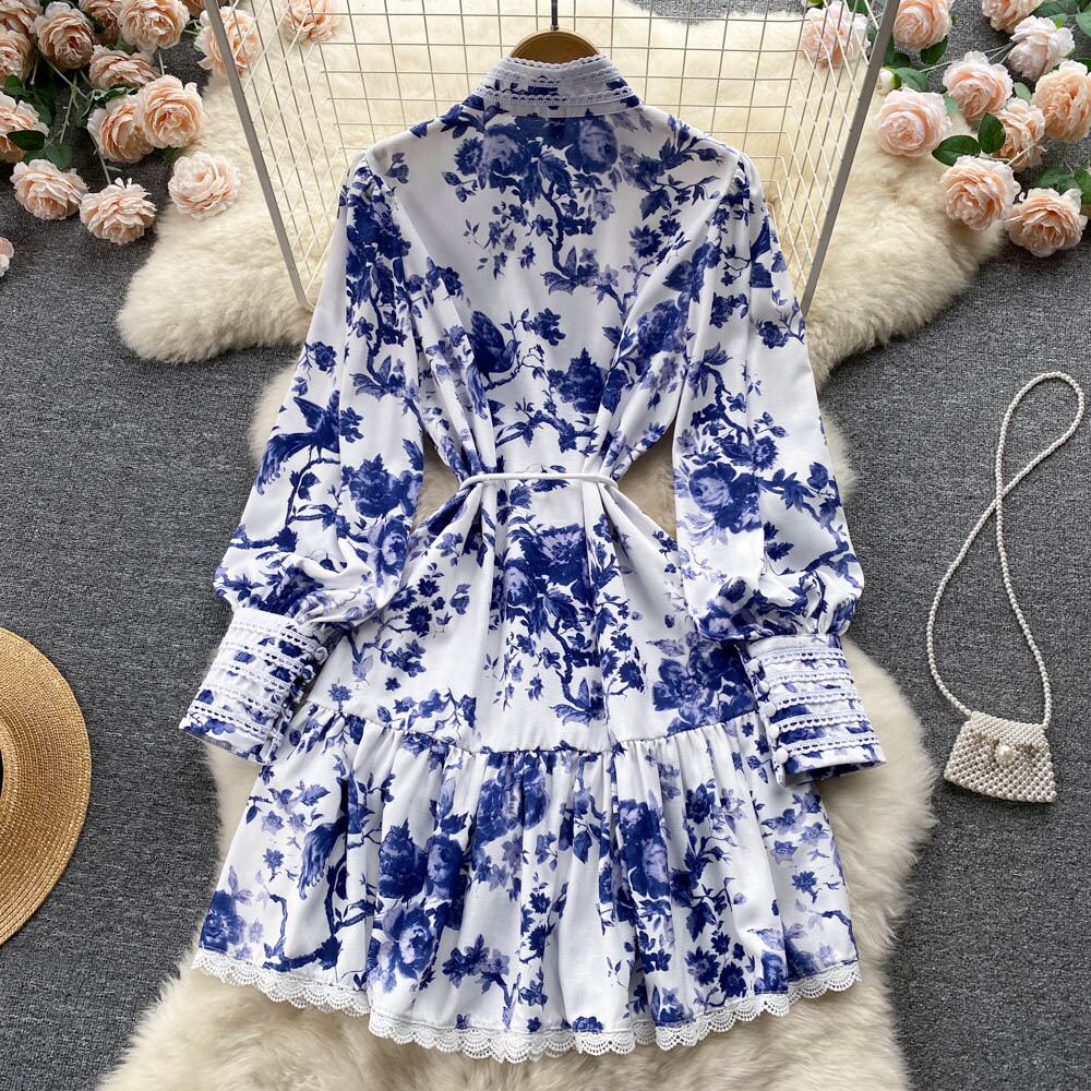 春の新作スタイルのスタンドカラー気質シングルブレストランタンスリーブフリンジウエストプリントワンピーススウィートニー丈スカート 大人ガーリー キュート カジュアル スプリング 春物 lyxaj50867846604