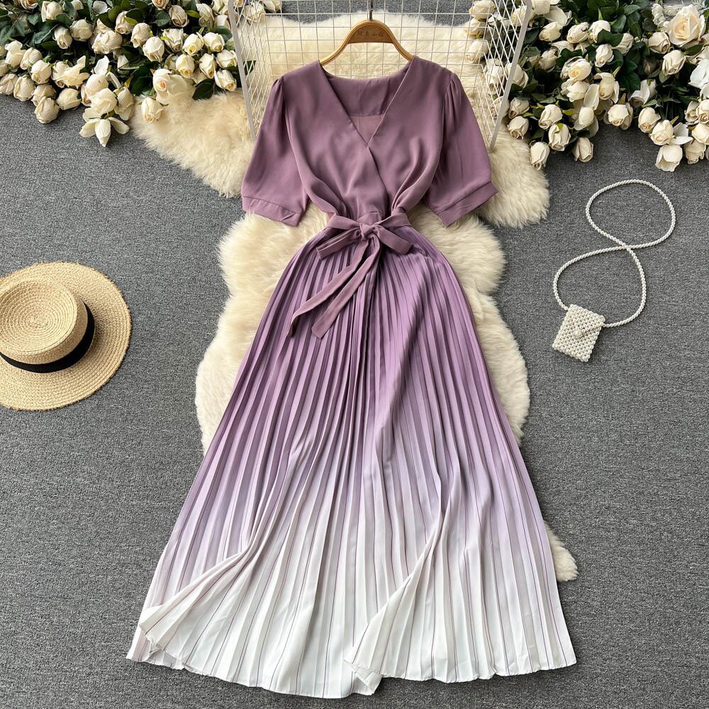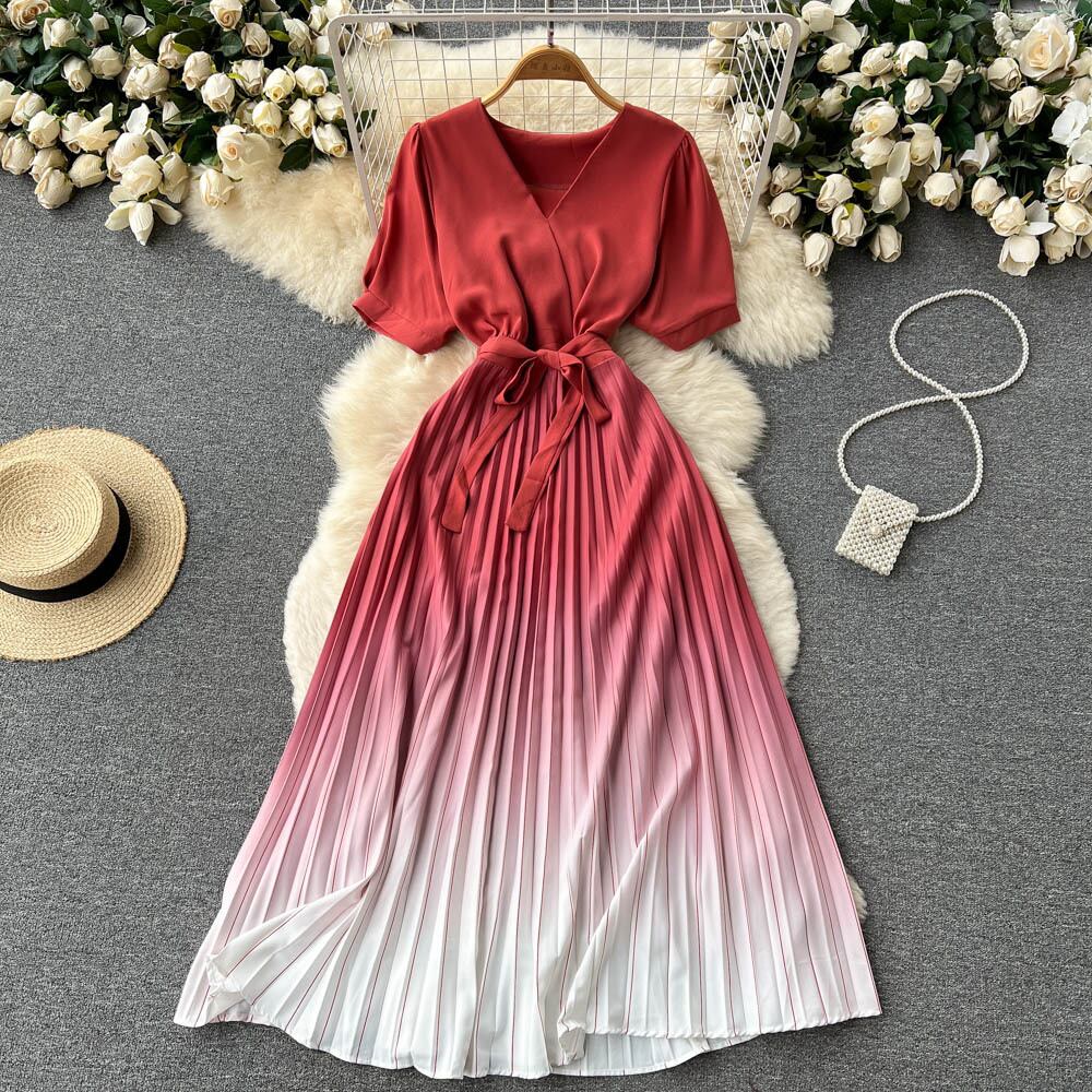 レトロなグラデーションドレスレディースファッショナブルなストラップウエストスリムVネックライトおなじみのスタイルプリーツ膝上フレンチドレス lyxaj23595651126