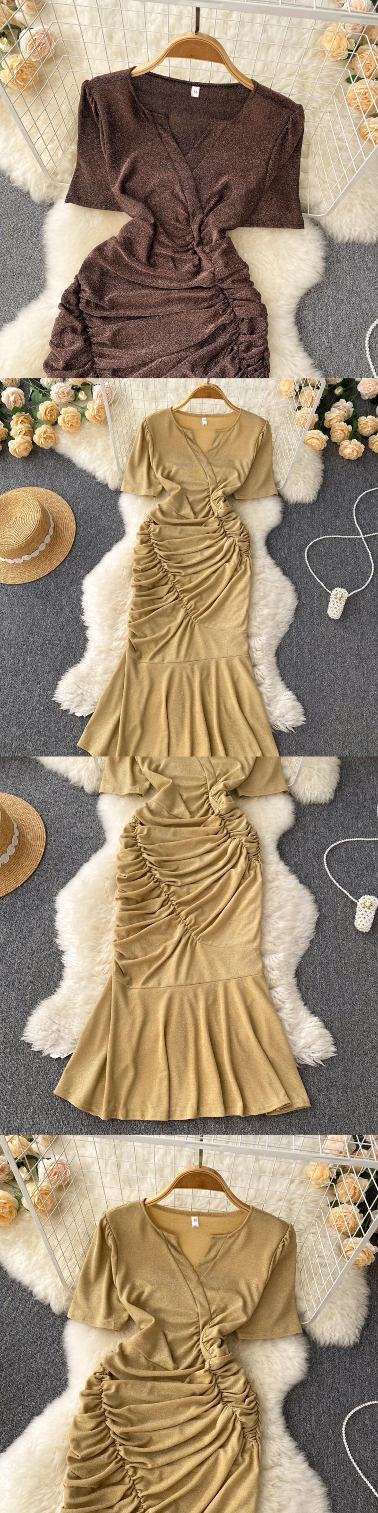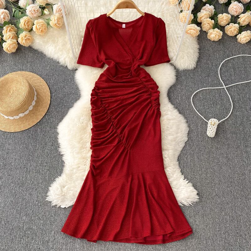レトロなスーパーフェアリートラベルシュートホリデーイン風半袖Vネックフィッシュテールドレス女性プリーツスリムスリミングバッグヒップロングスカート lyxaj89535491661