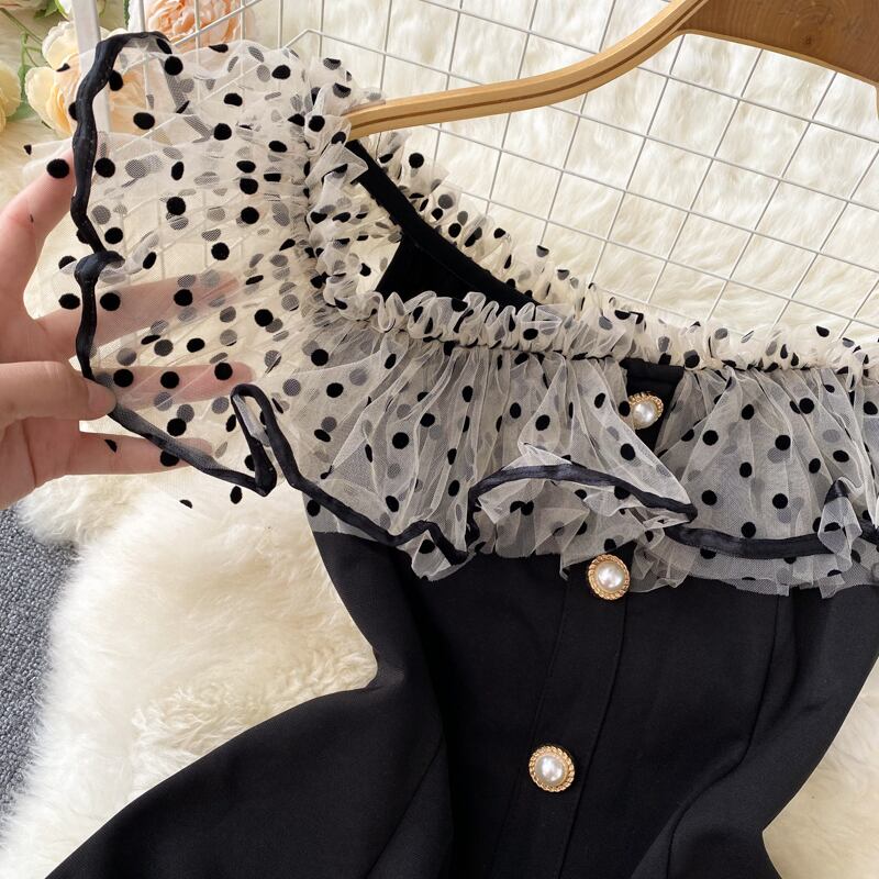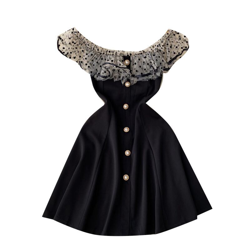 フランスのニッチな気質の女神ファンオフショルダーフリルヘップバーンスタイルリトルブラックドレスウエストセクシーなワンショルダードレス lyxaj46420416393