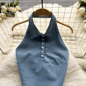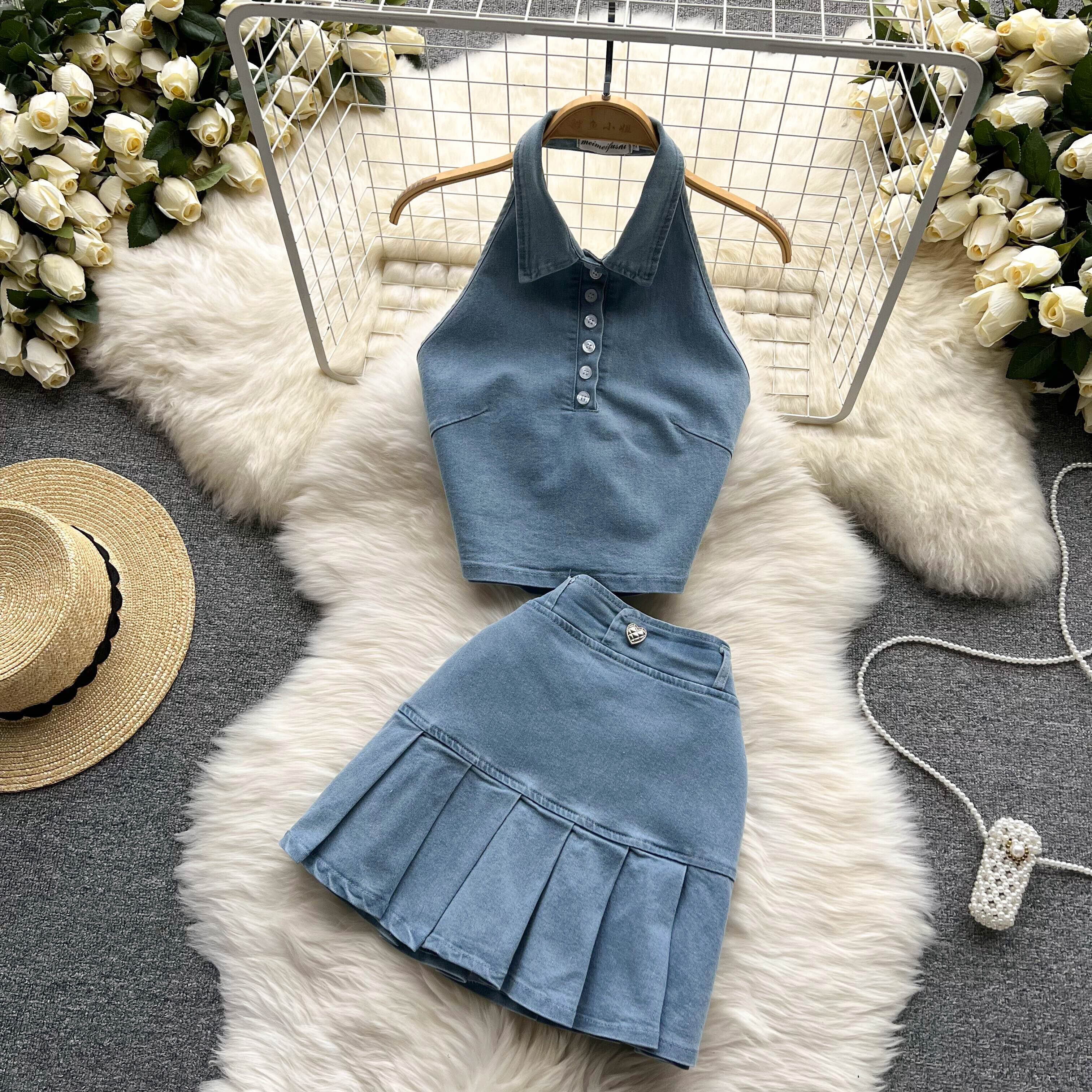 夏の新作文芸スモールフレッシュプリーツスカートレディースハイウエストシンスカートブレストホルタートップツーピースセット ハイウェスト サマー 夏物 lyxaj59185964509