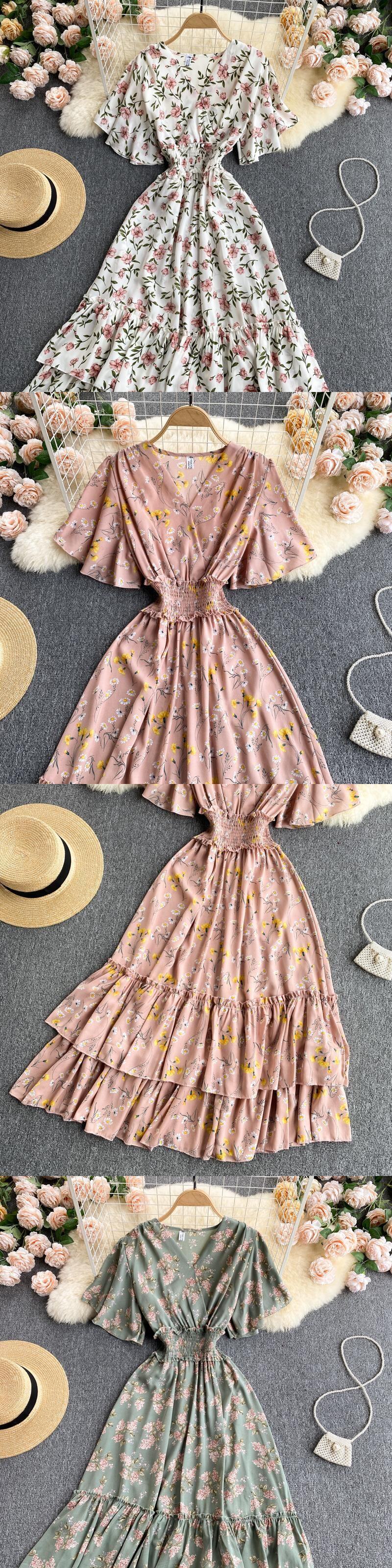 フレンチドレス2021年新作サマードレス気質Vネック伸縮性ウエスト薄フリルフローラルホリデースカート エラスティック 夏物 花柄 lyxaj55688457744