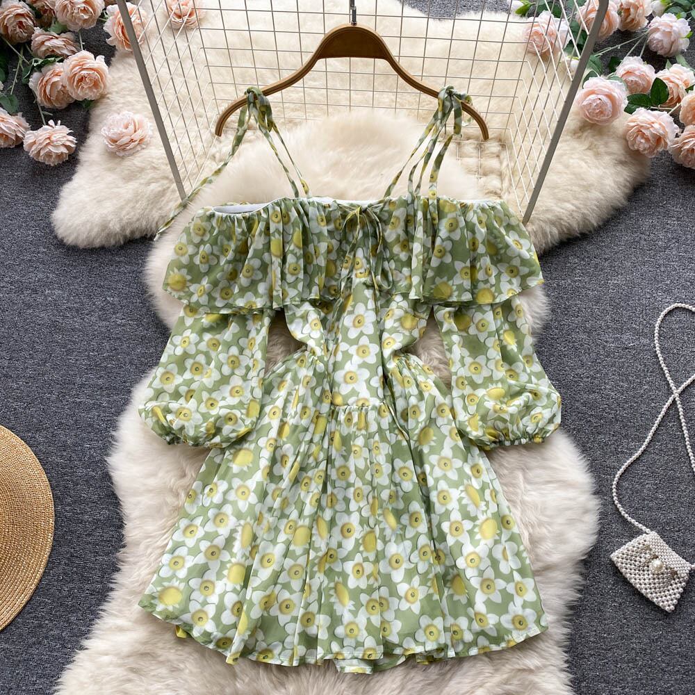 ホリデートラベルウェアワンショルダーパフスリーブドレスレディースサマーロータスリーフオープンバックウエストパフィーサスペンダースカート 夏物 lyxaj24946034990